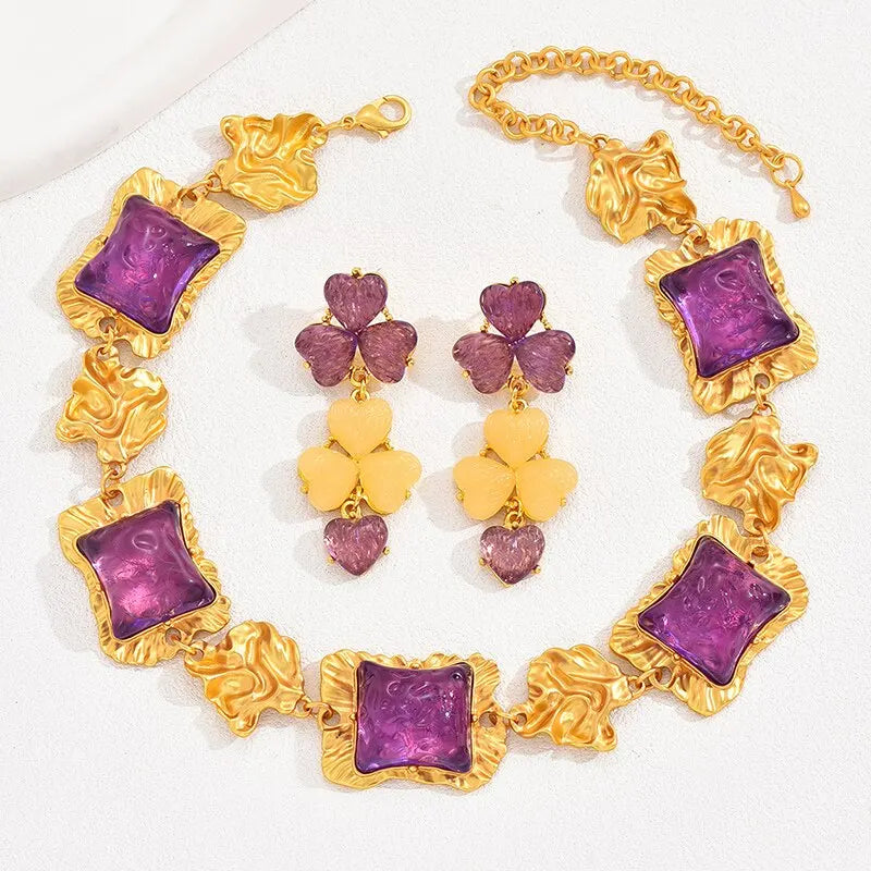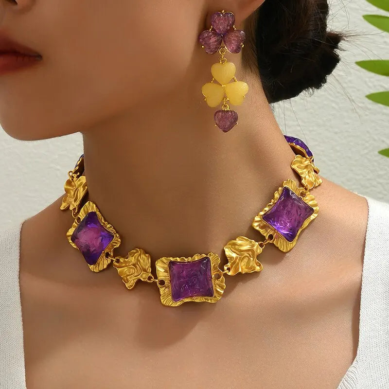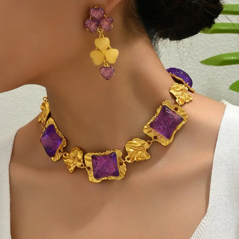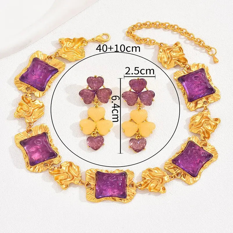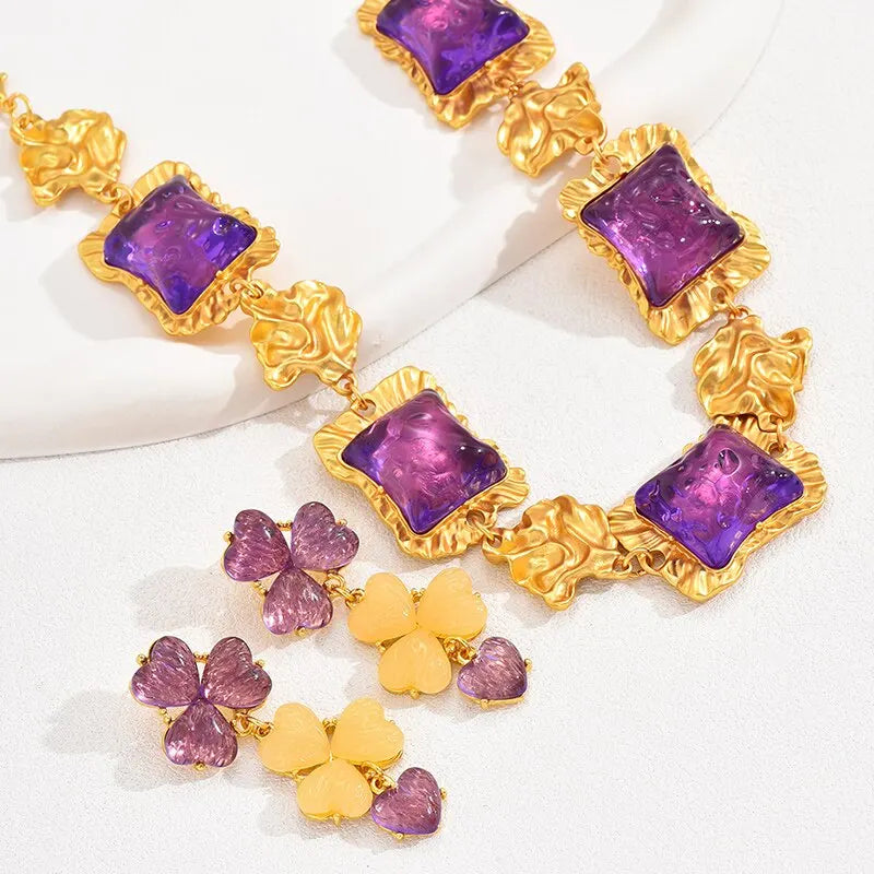 Conjunto de 2 joyas con piedra morada cuadrada, collar, pendientes chapados en oro con forma de flor, metal martillado para mujer, estilo moderno.