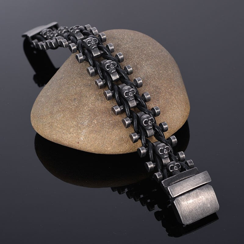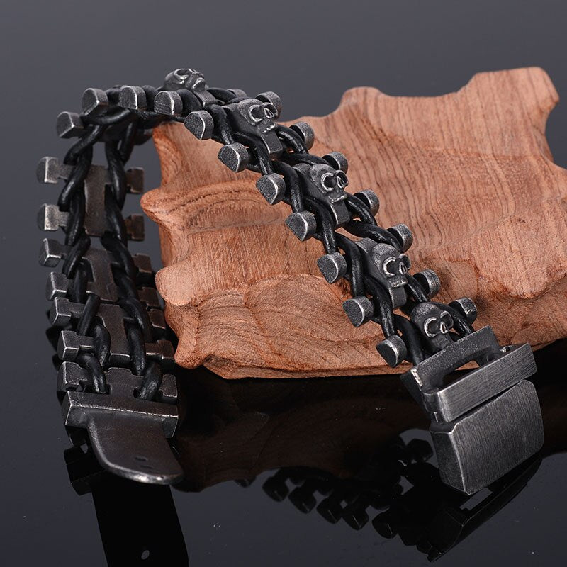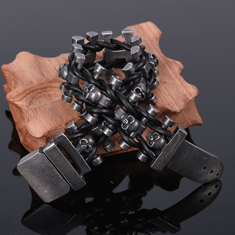 Pulsera de calavera de 25 mm de ancho para hombre, hecha a mano, de cuero y acero inoxidable, estilo gótico.