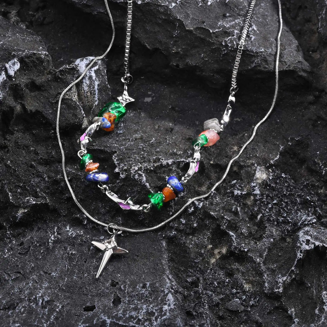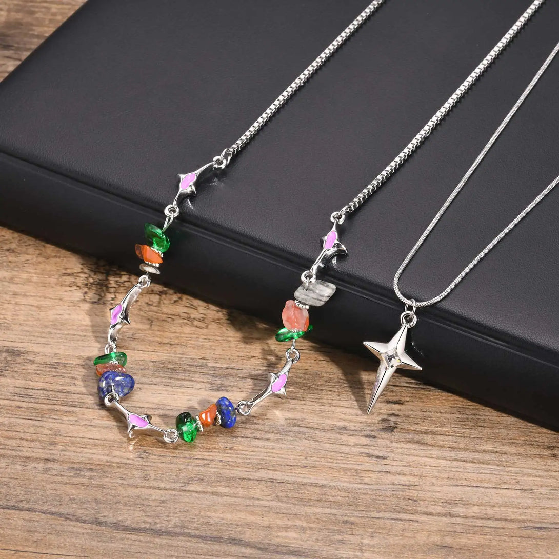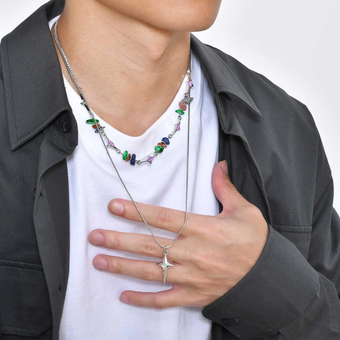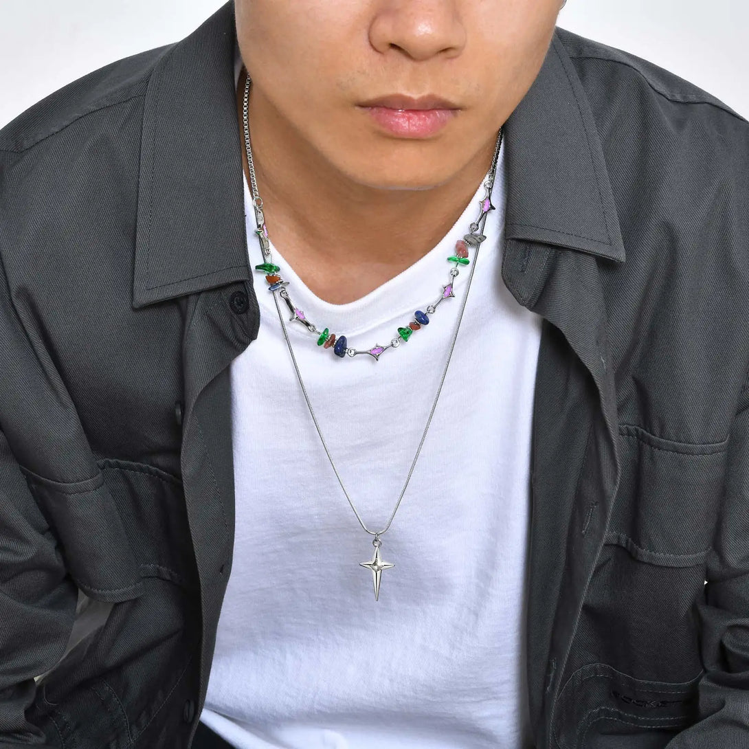Juego de 2 collares apilados para hombres y niños, colgante de estrella de cuatro puntas con superposición de piedras de colores, joyería de playa para vacaciones de verano.