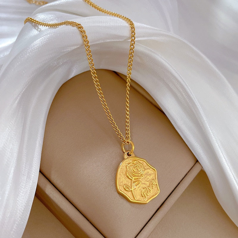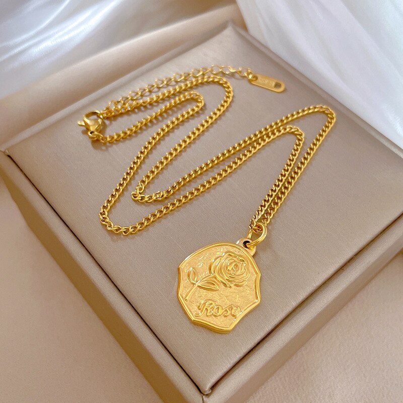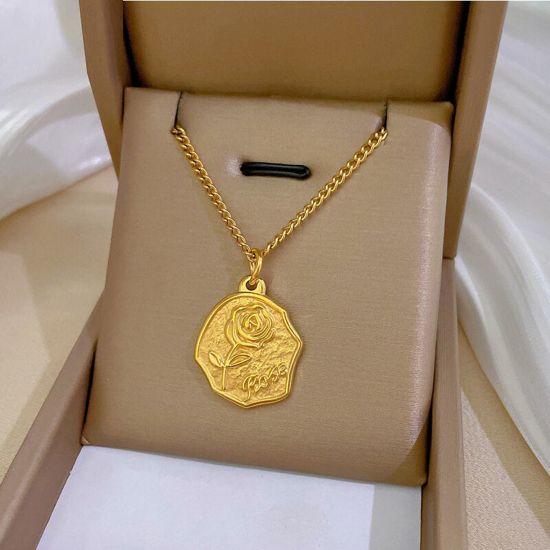 Collar con colgante irregular de acero inoxidable 316L con personalidad rosa y temperamento de oro 585 para niña, exquisita cadena de clavícula.