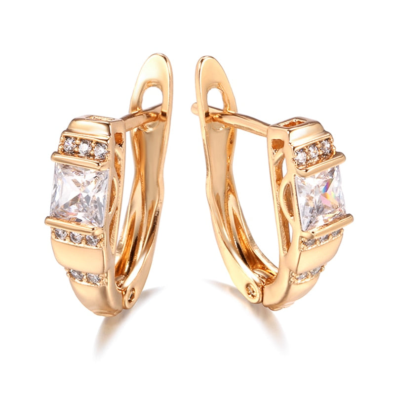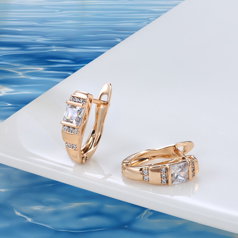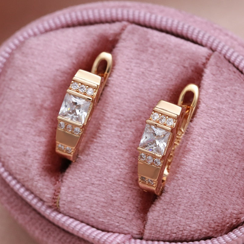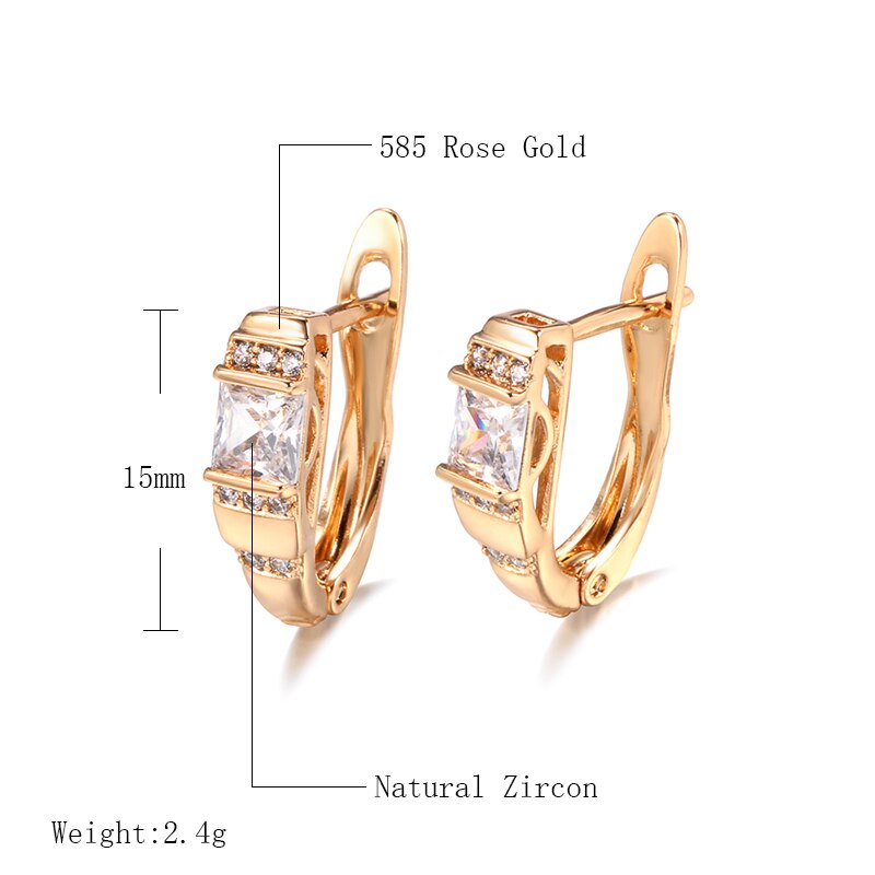 Joyería de oro 585 - Pendientes de oro rosa 585 con circonita cuadrada central, corte de piedra, cristal multicapa, circonita cúbica de metal natural, joyería fina de moda para fiestas.