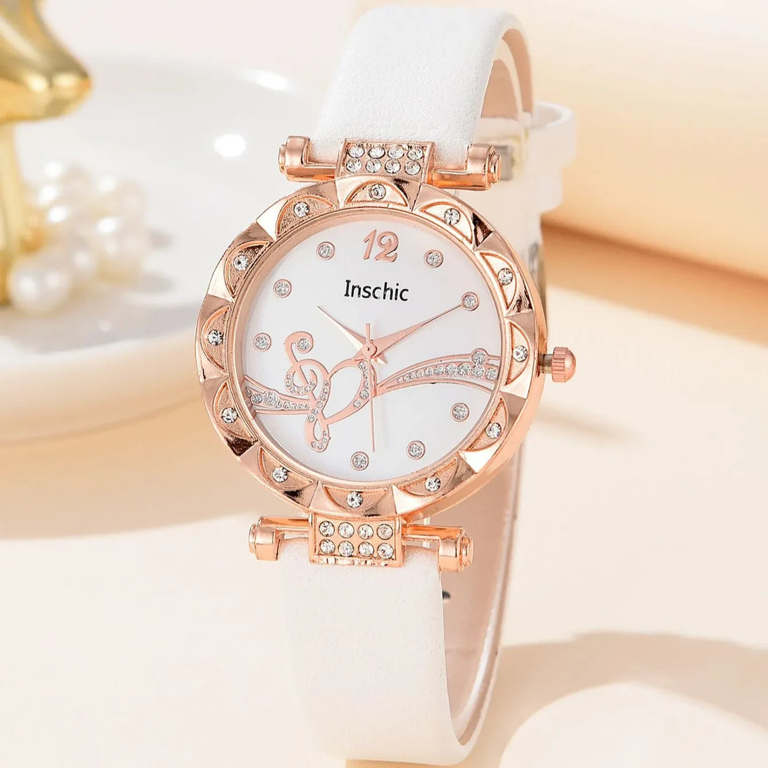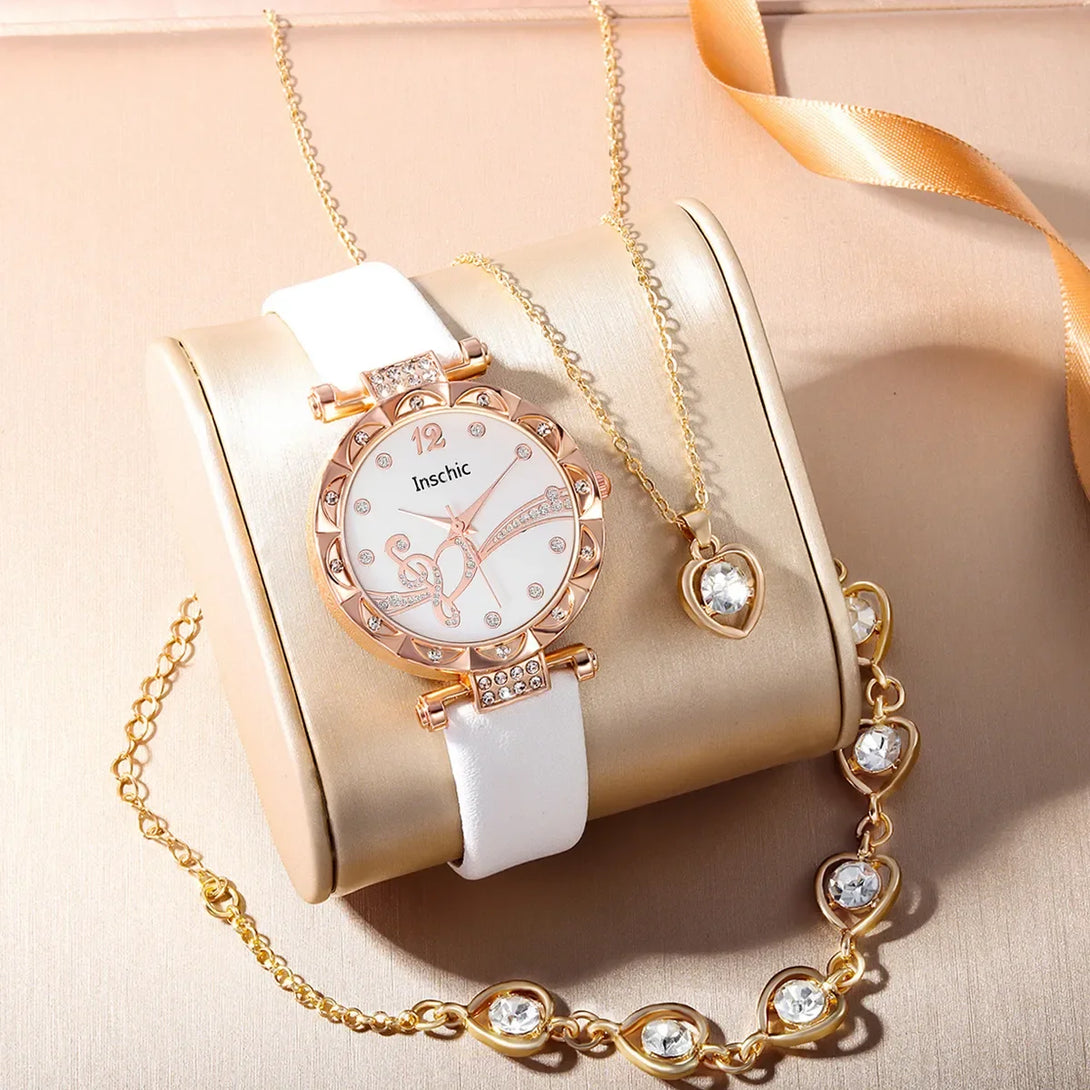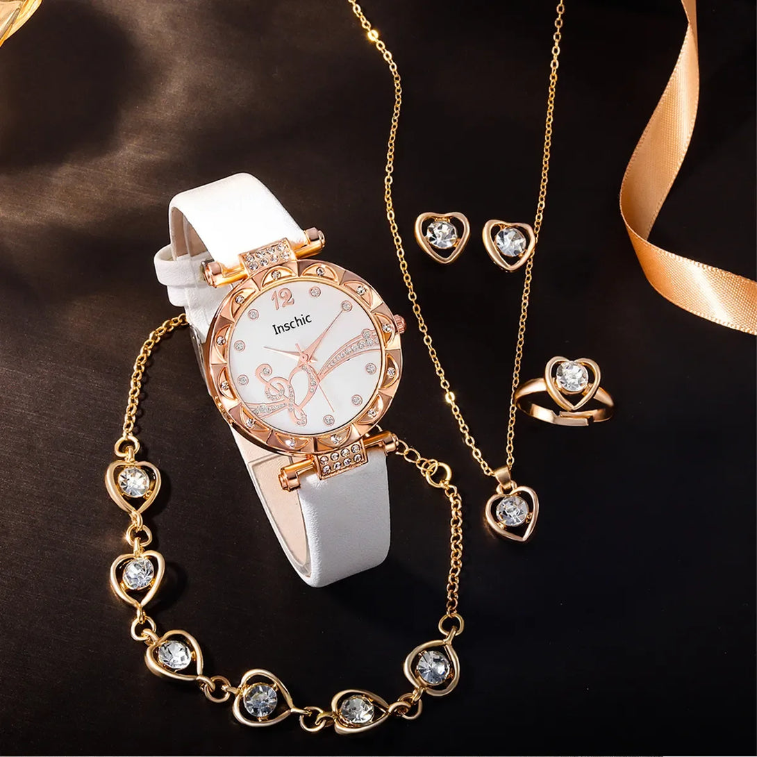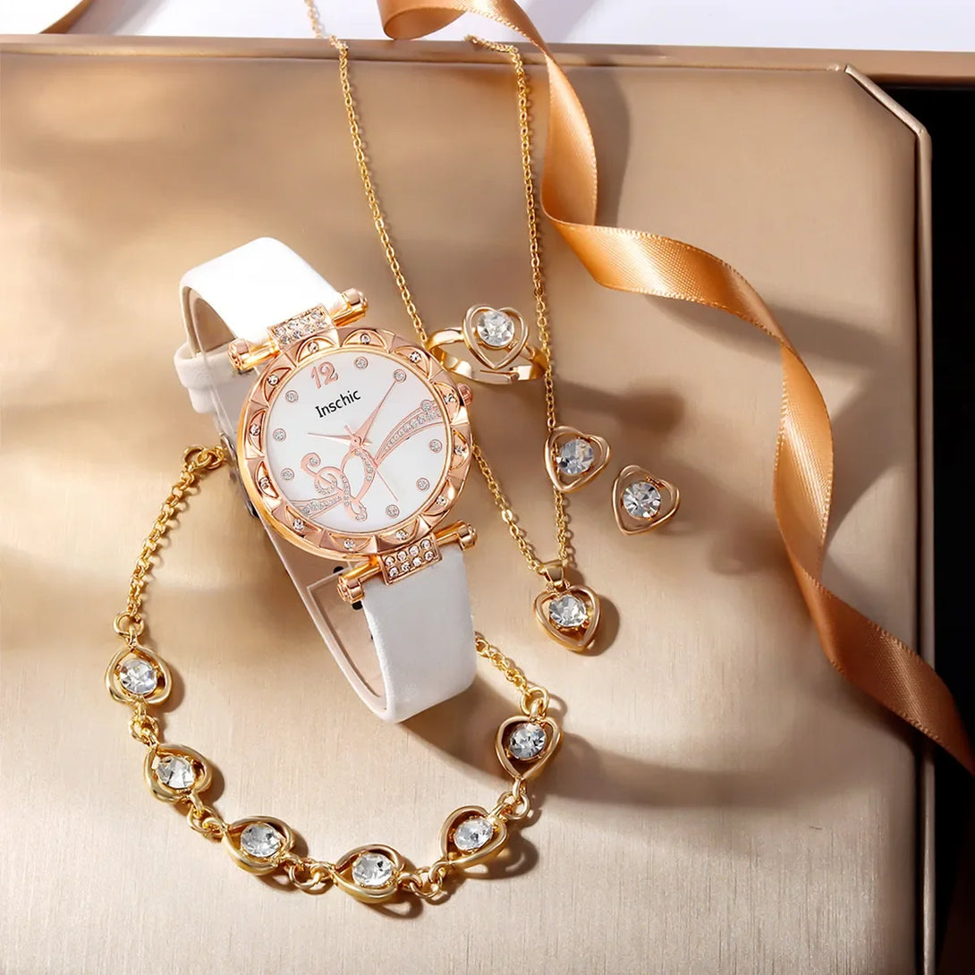 Conjunto de 6 piezas de joyería de lujo con diamantes de imitación para mujer, anillo, collar, pendientes y pulsera, reloj de cuarzo con correa de cuero digital simple.