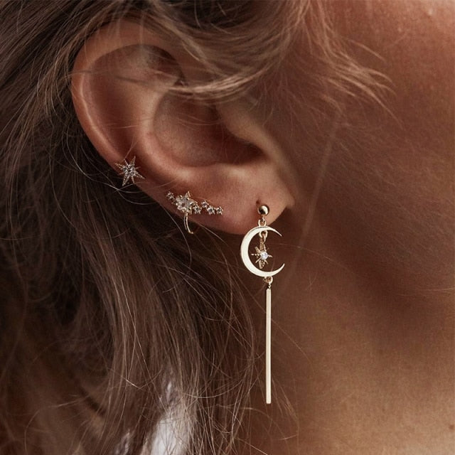 Juego de 7 pendientes con clip de cristal, forma de estrella y luna, estilo punk, con personalidad