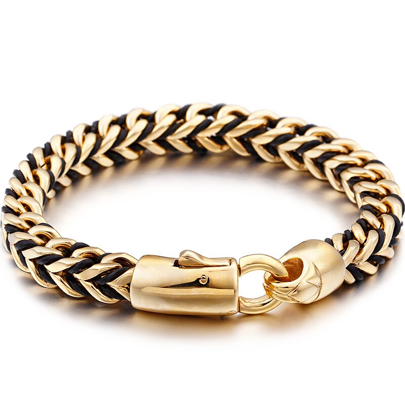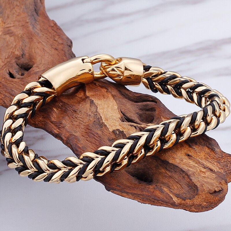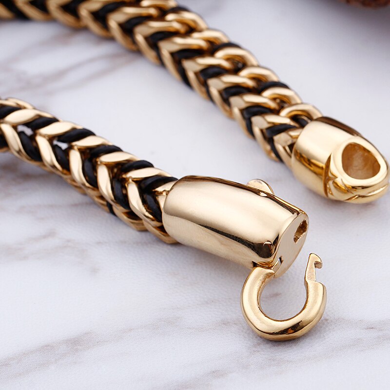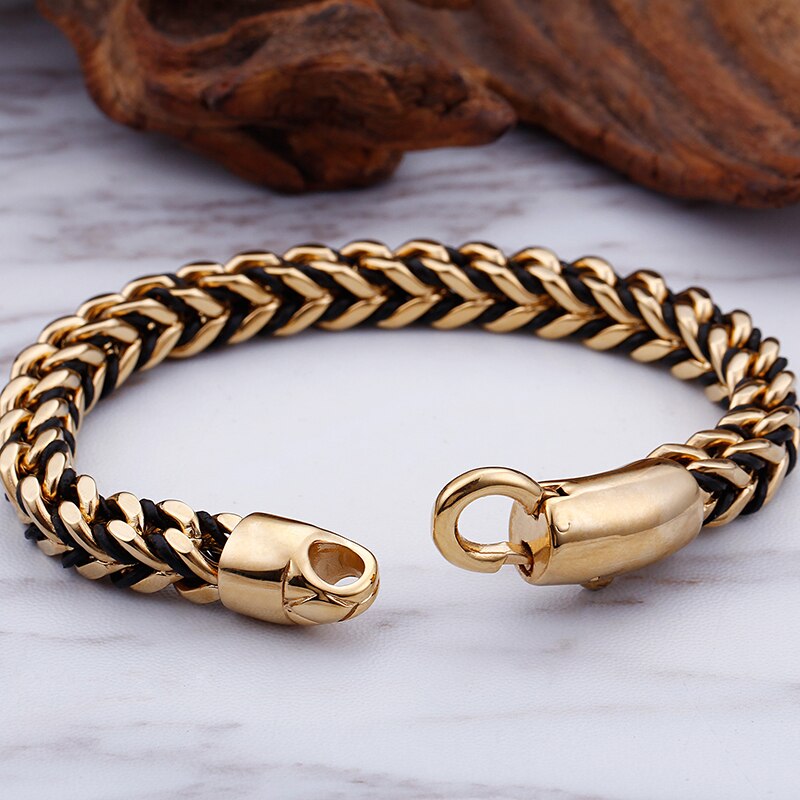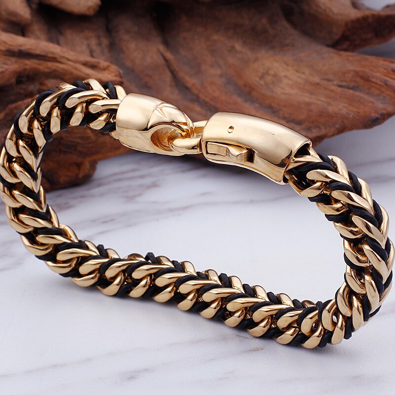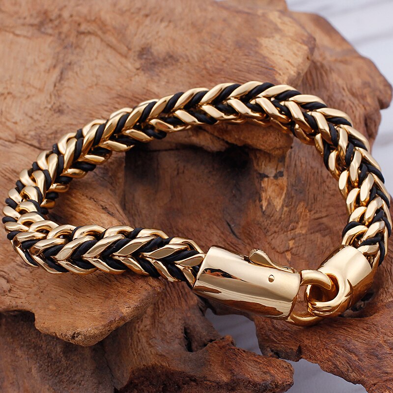 Pulseras clásicas de cuero trenzado de lujo de acero inoxidable para hombre, de 8 mm, con cuerda de cuero tejida.