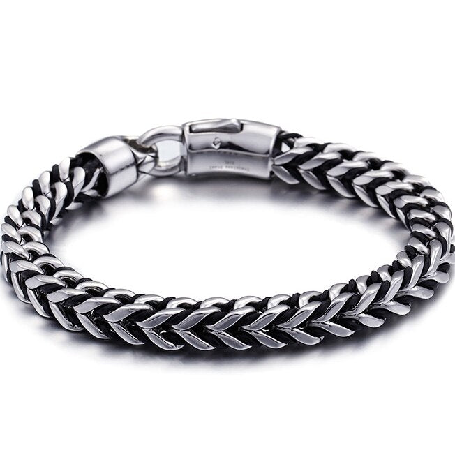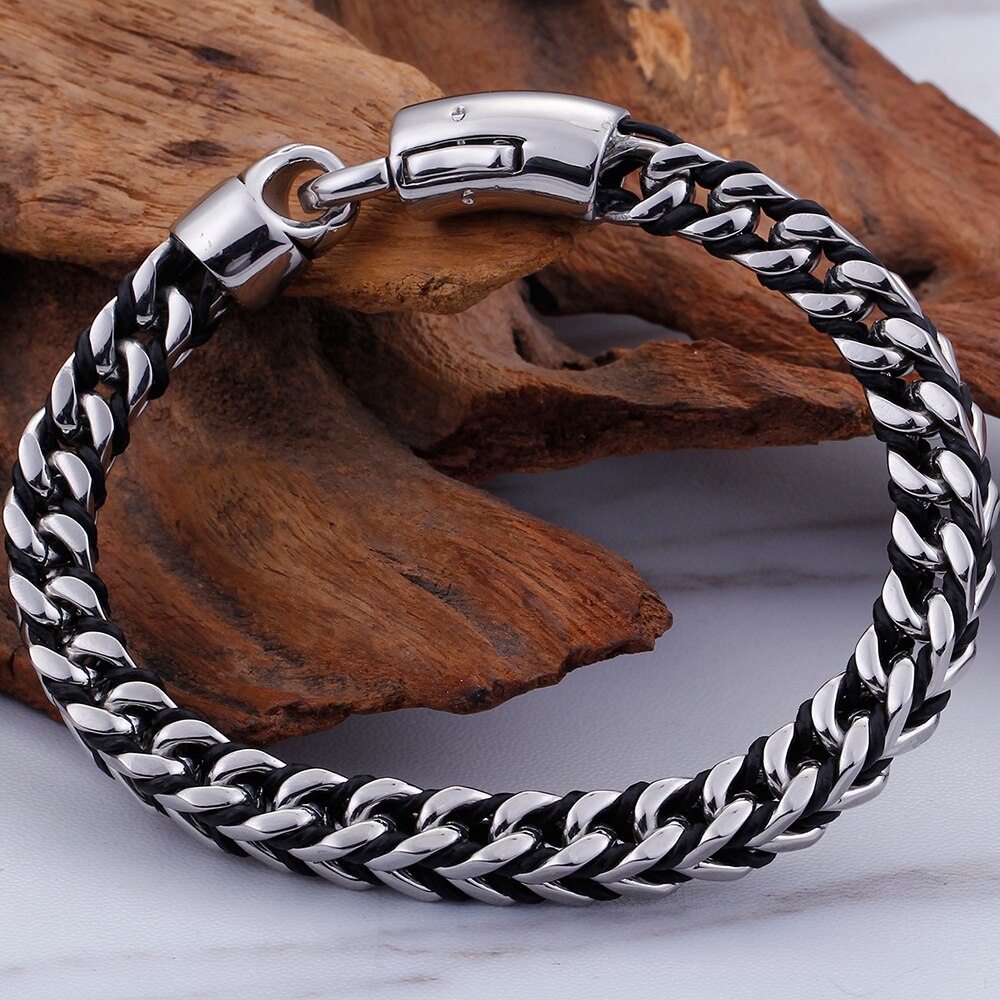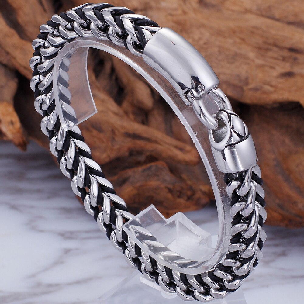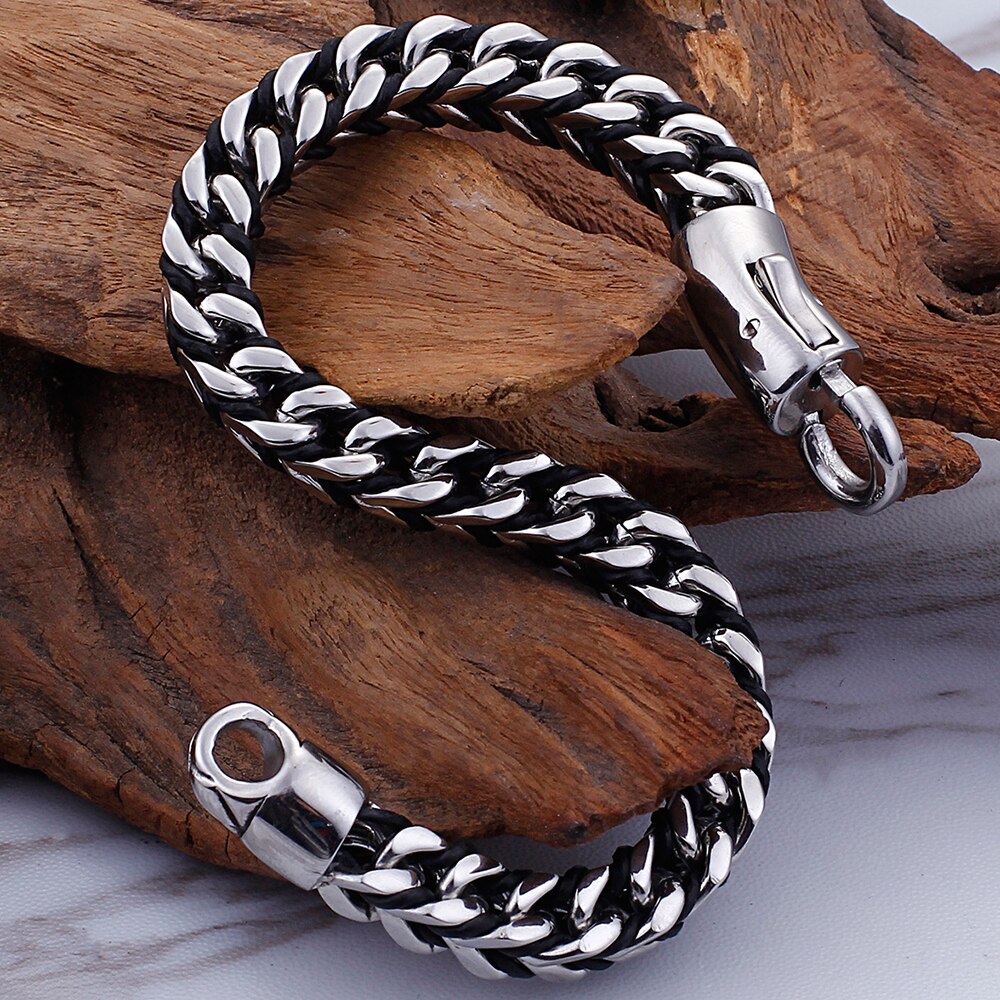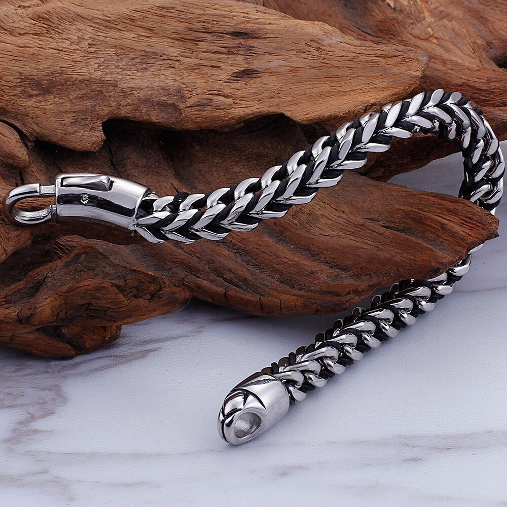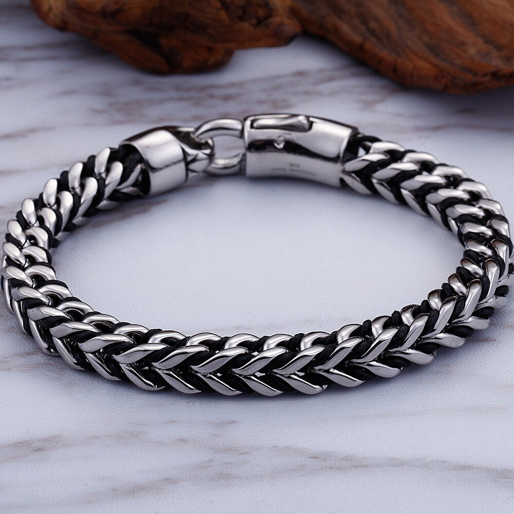 Pulsera trenzada de cuero genuino de 9 pulgadas para hombre, pulsera de acero inoxidable para hombre.