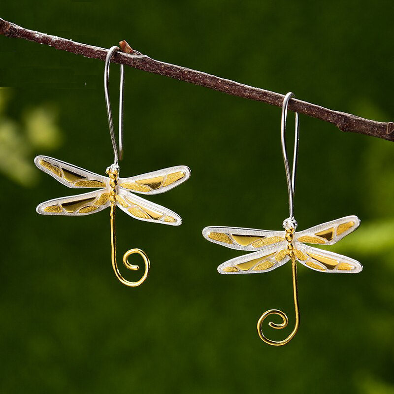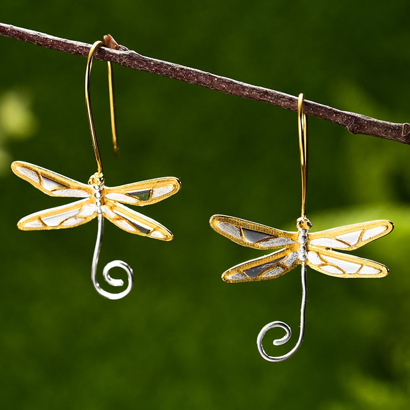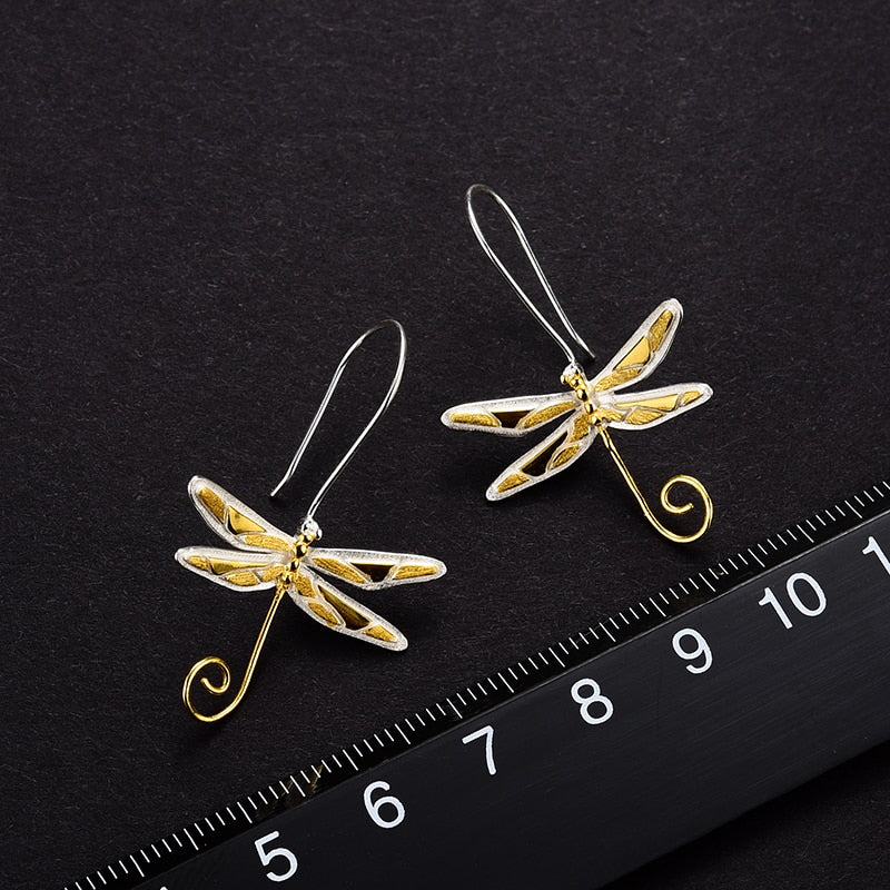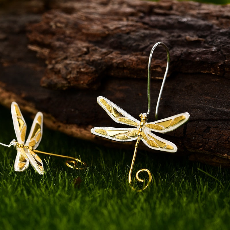 Pendientes colgantes de libélula en plata de ley 925 y oro de 18 quilates para mujer