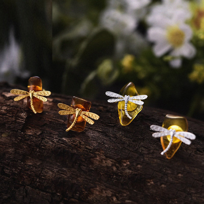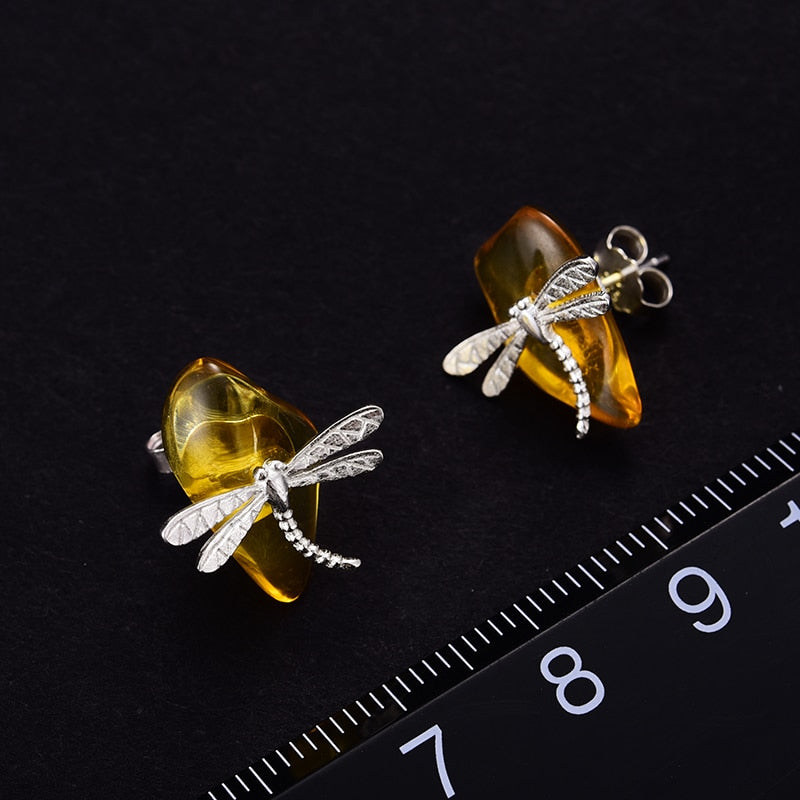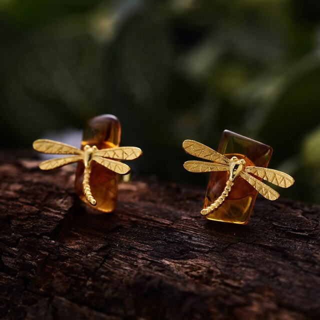 Pendientes de moda: auténtica plata de ley 925, ámbar natural, joyería fina hecha a mano, oro de 18 quilates, bonitos pendientes de libélula para mujer.
