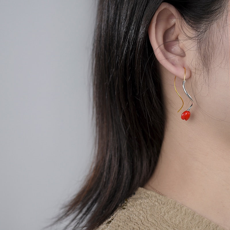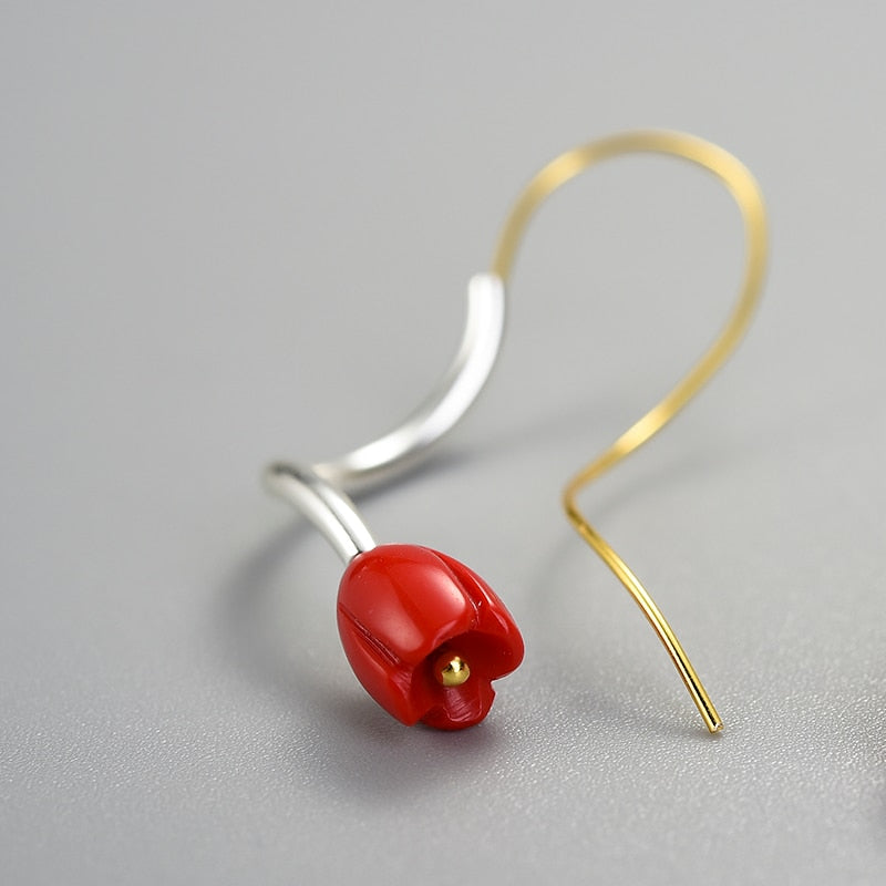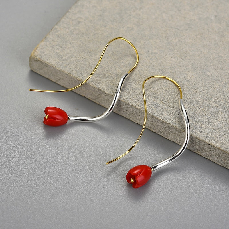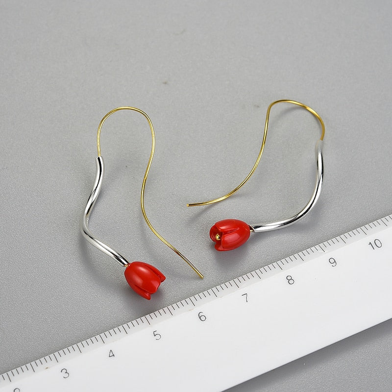 Pendientes colgantes de flor de rosa roja de estilo étnico en plata de ley 925