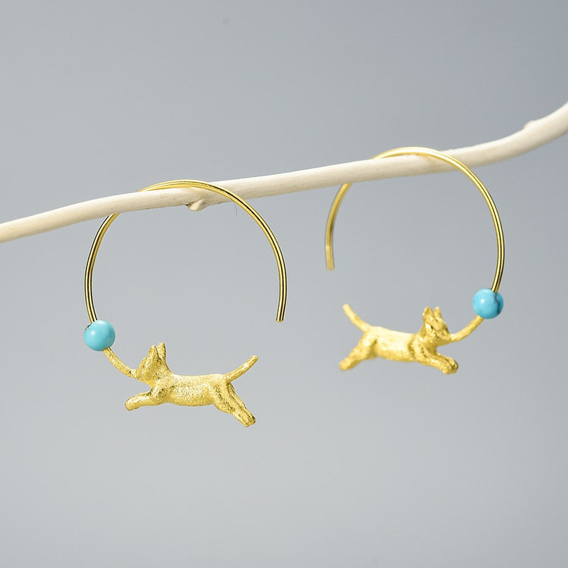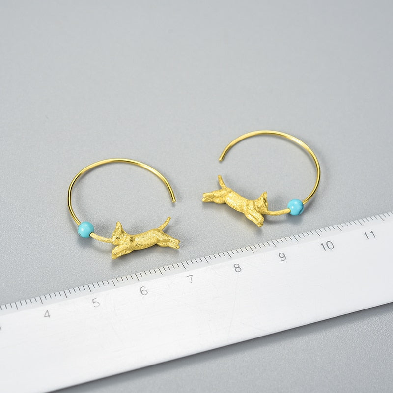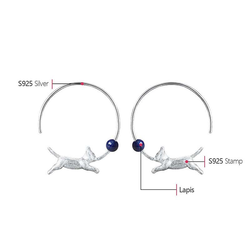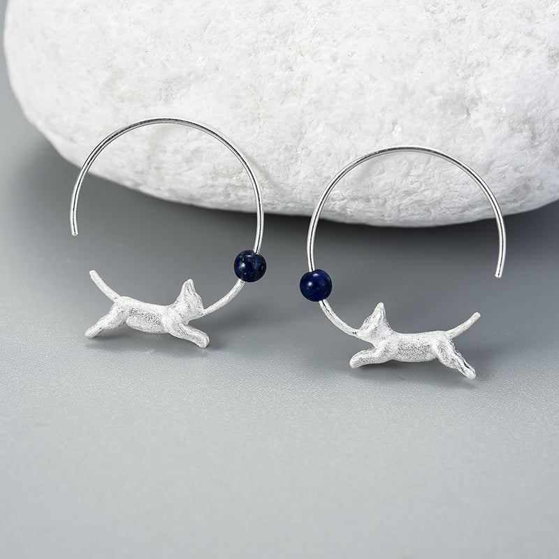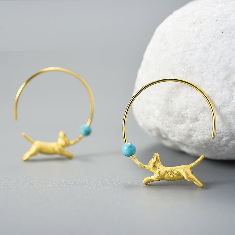 Pendientes de aro redondos con adorable gato corriendo y globo en plata de ley 925 con piedra verde
