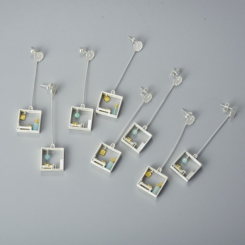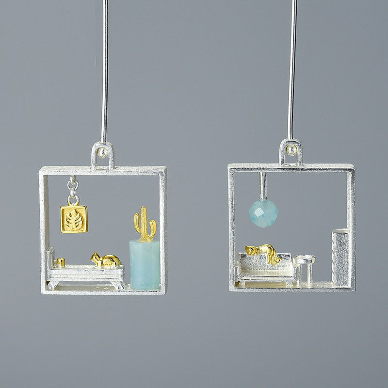 Pendientes colgantes cuadrados grandes de gato perezoso en casa de plata de ley 925 para mujer