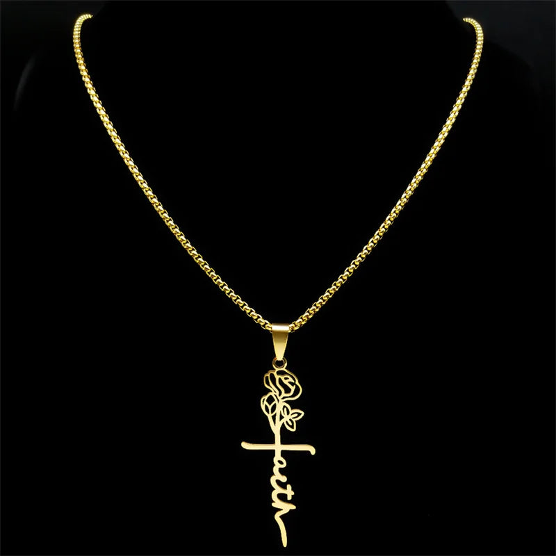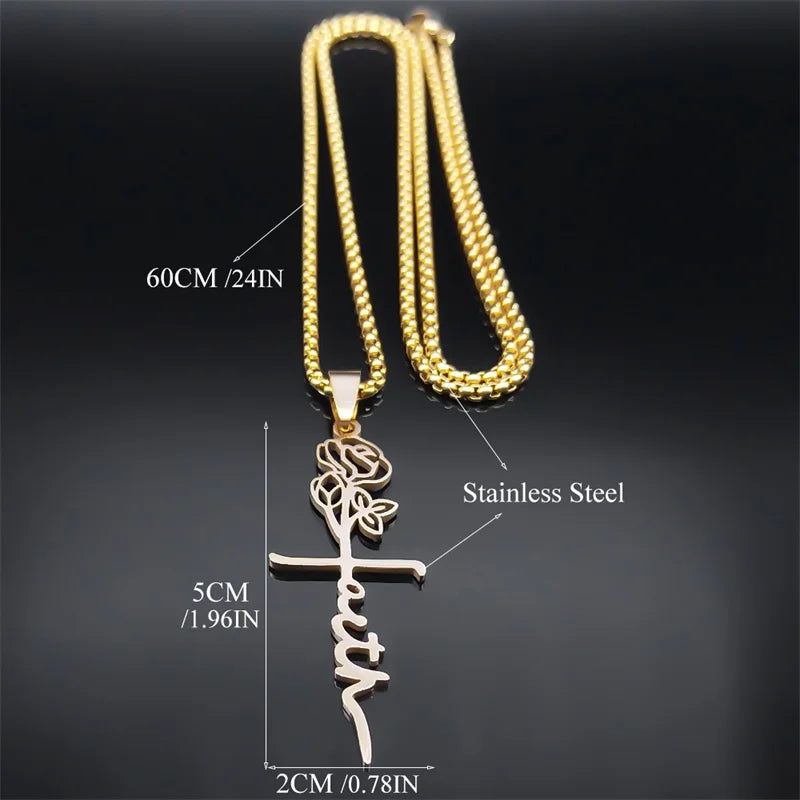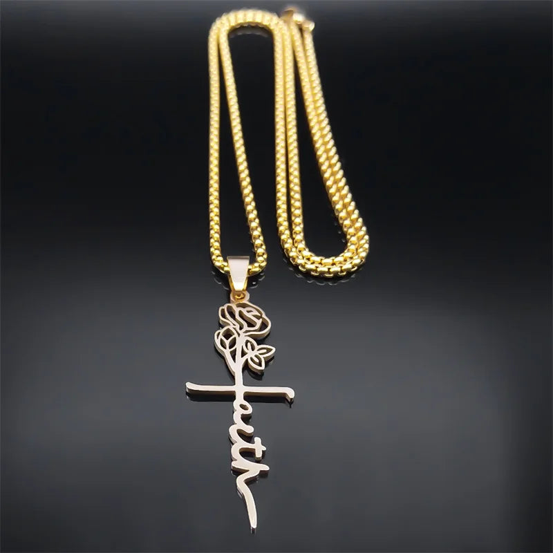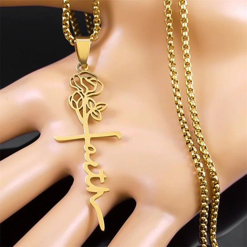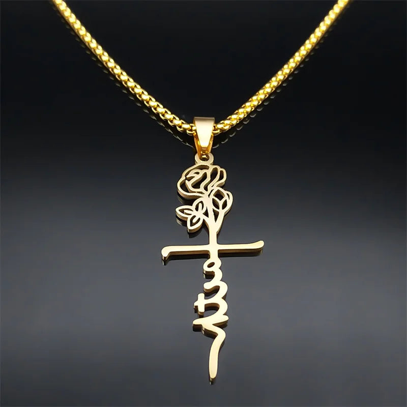 Collar con colgante de cruz de Cristo, rosa y flor de acero inoxidable, color dorado, para mujeres y hombres, cadena cristiana, joyería