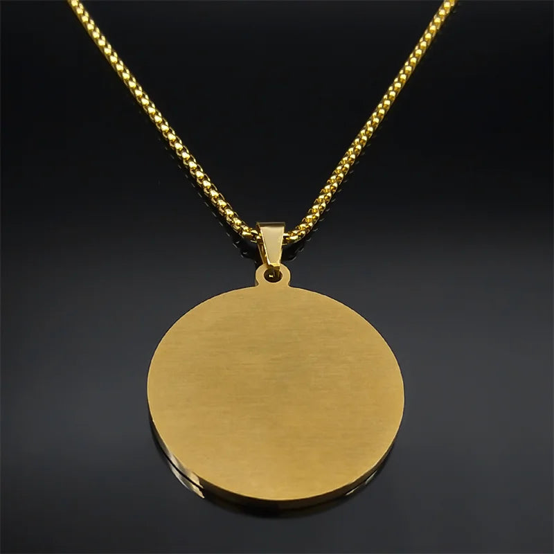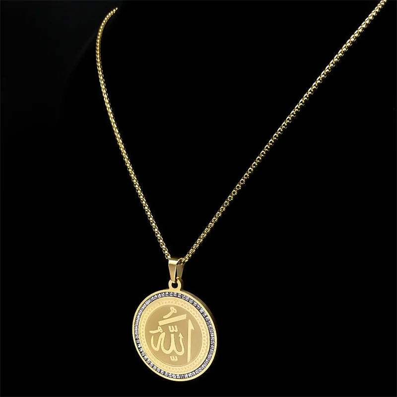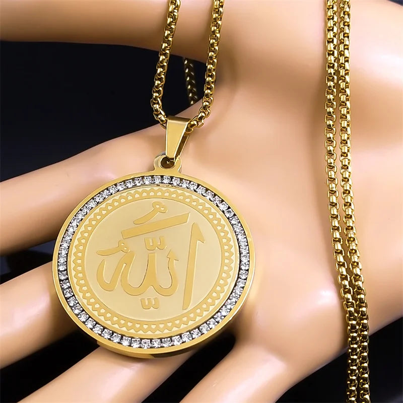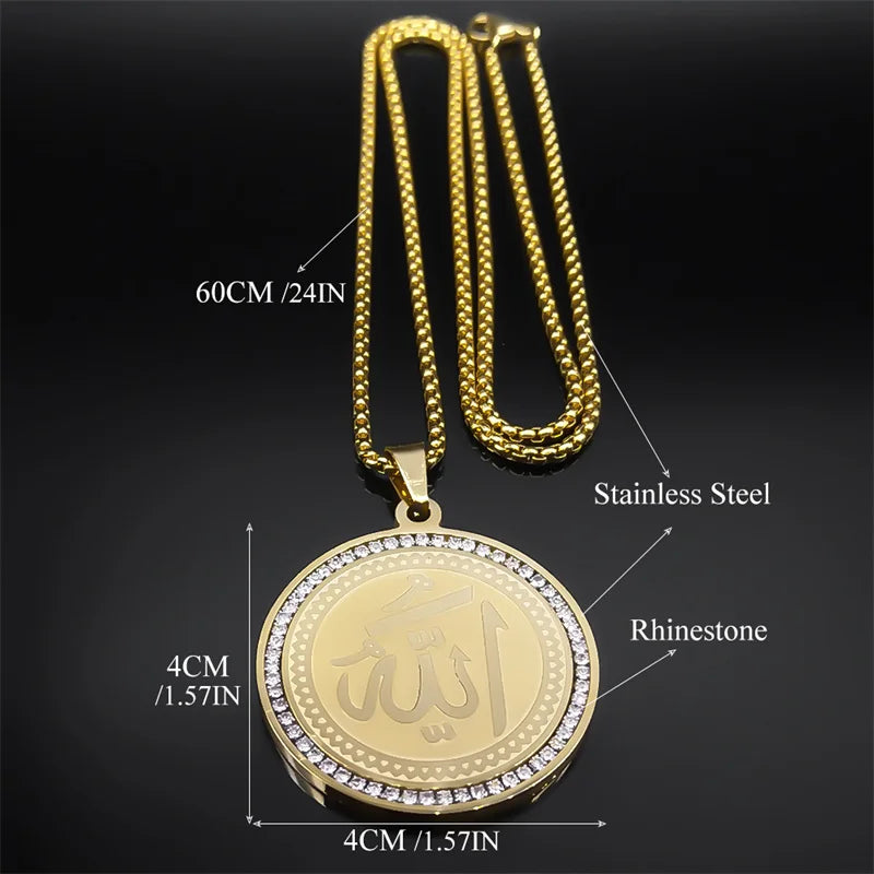 Collar con medalla de Alá del Corán árabe para mujeres y hombres, con diamantes de imitación de acero inoxidable, color dorado, cadena musulmana islámica, joyería