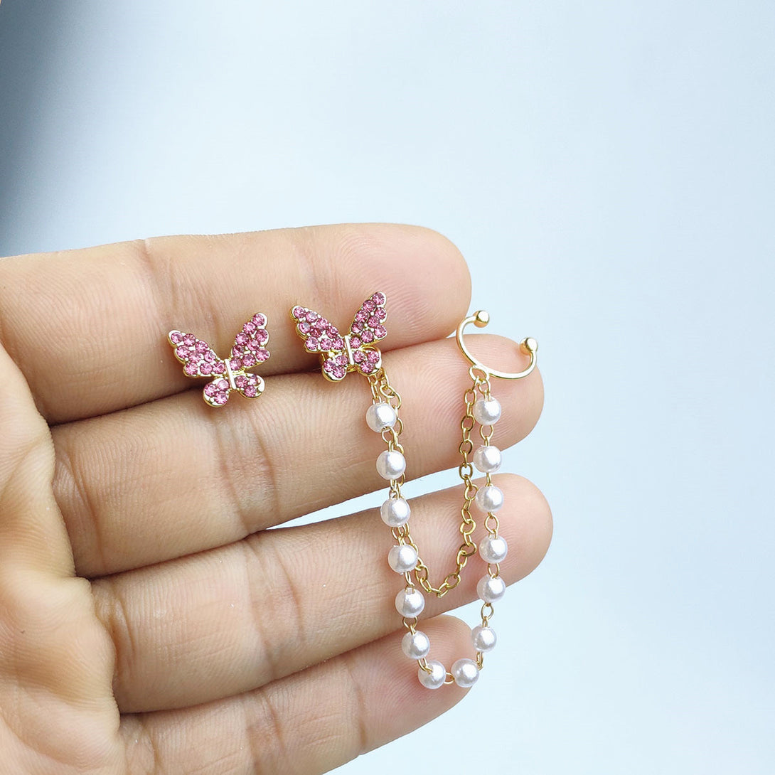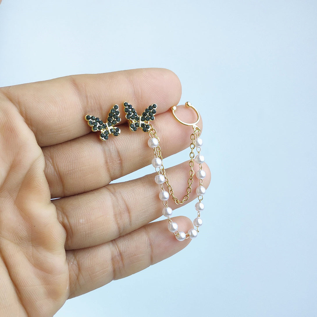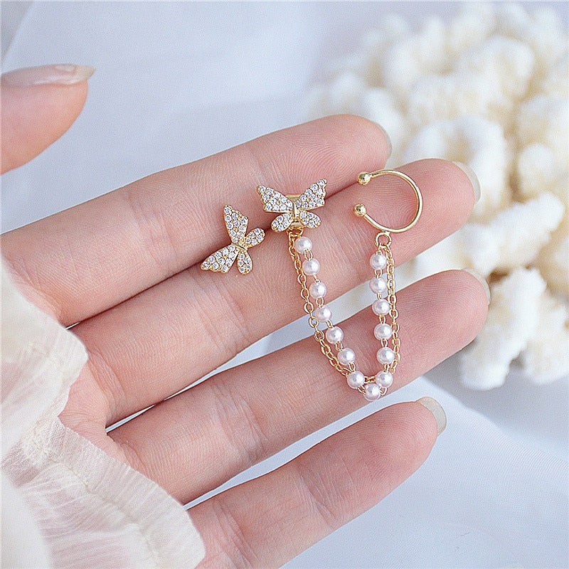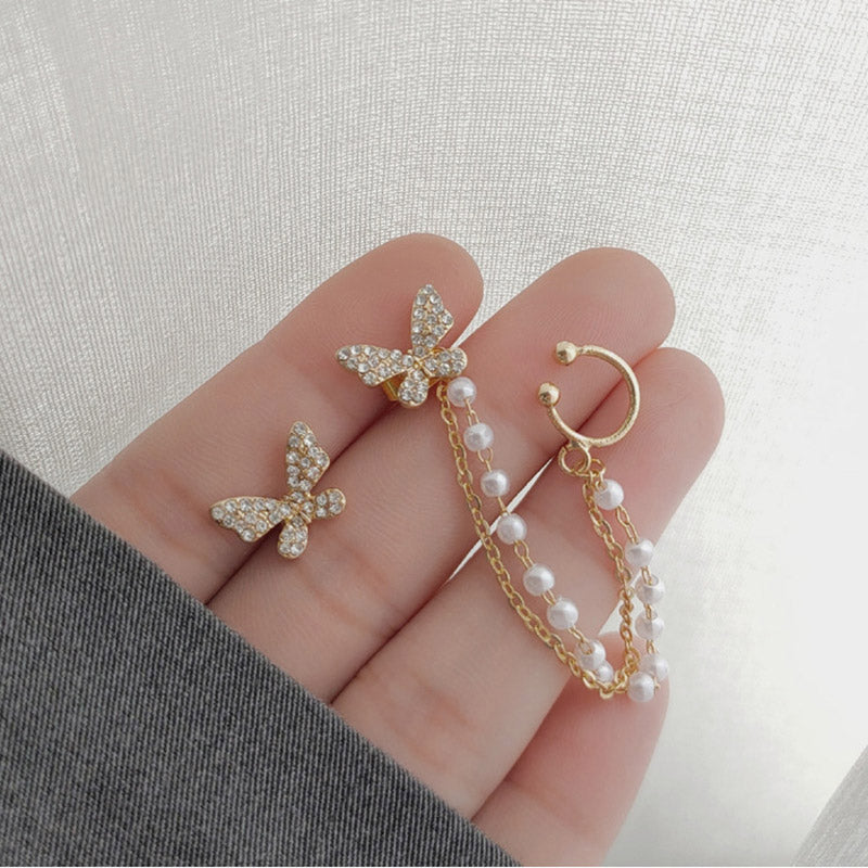 Pendientes de moda minimalistas asimétricos con forma de mariposa de cristal y clip para oreja, cadena larga dorada con perlas, para mujer, joyería para bodas y fiestas.