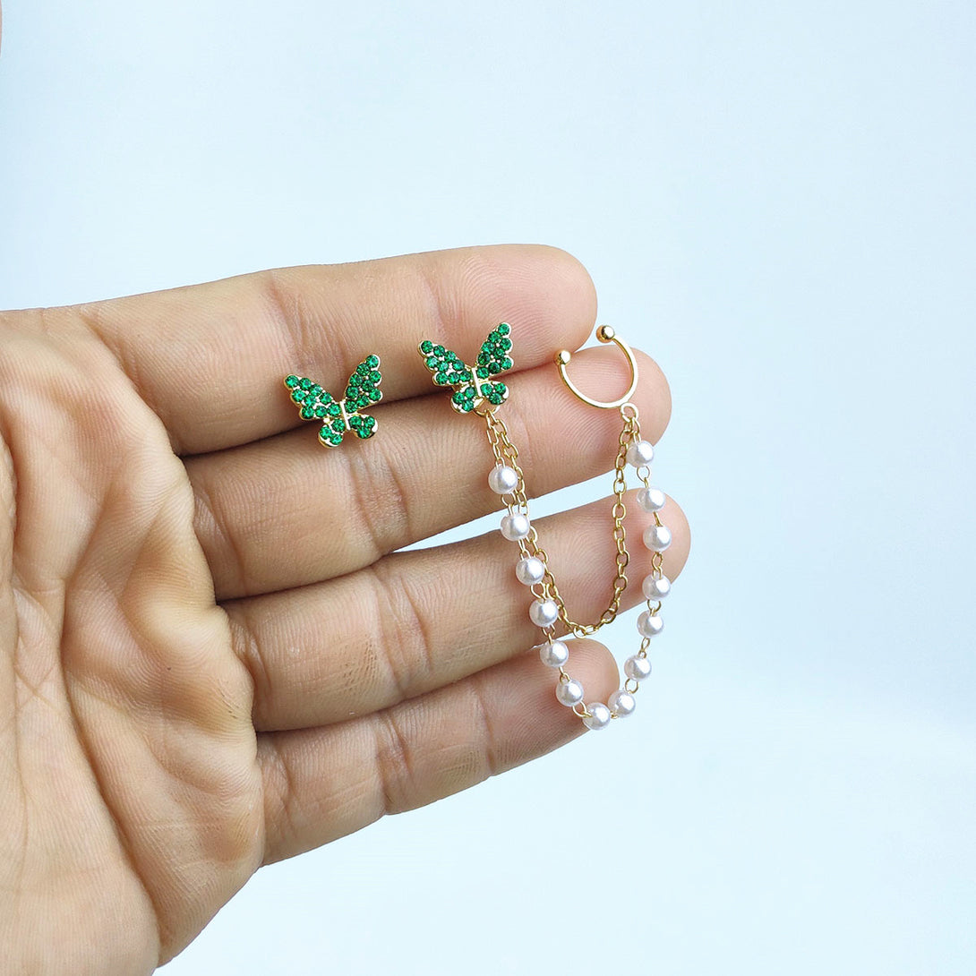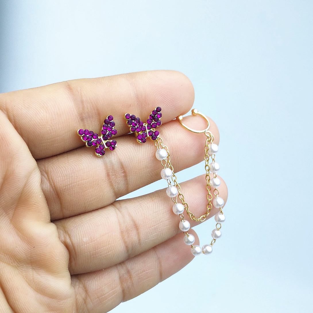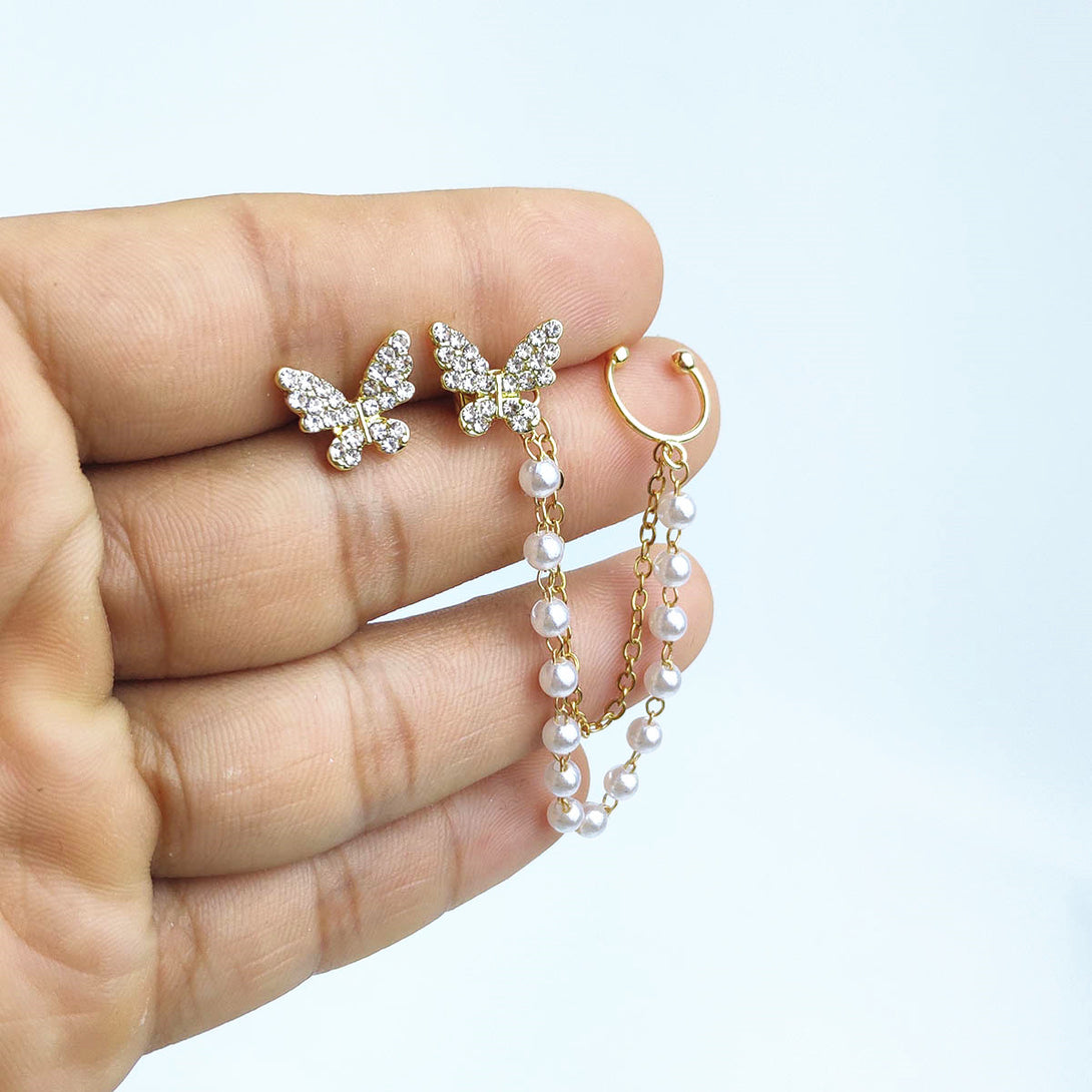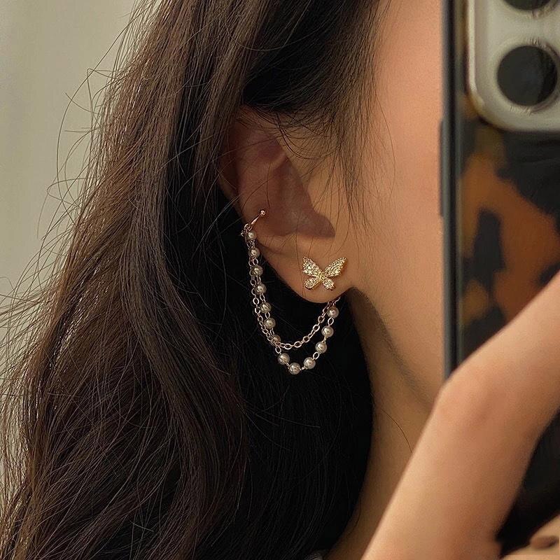 Pendientes de moda minimalistas asimétricos con forma de mariposa de cristal y clip para oreja, cadena larga dorada con perlas, para mujer, joyería para bodas y fiestas.