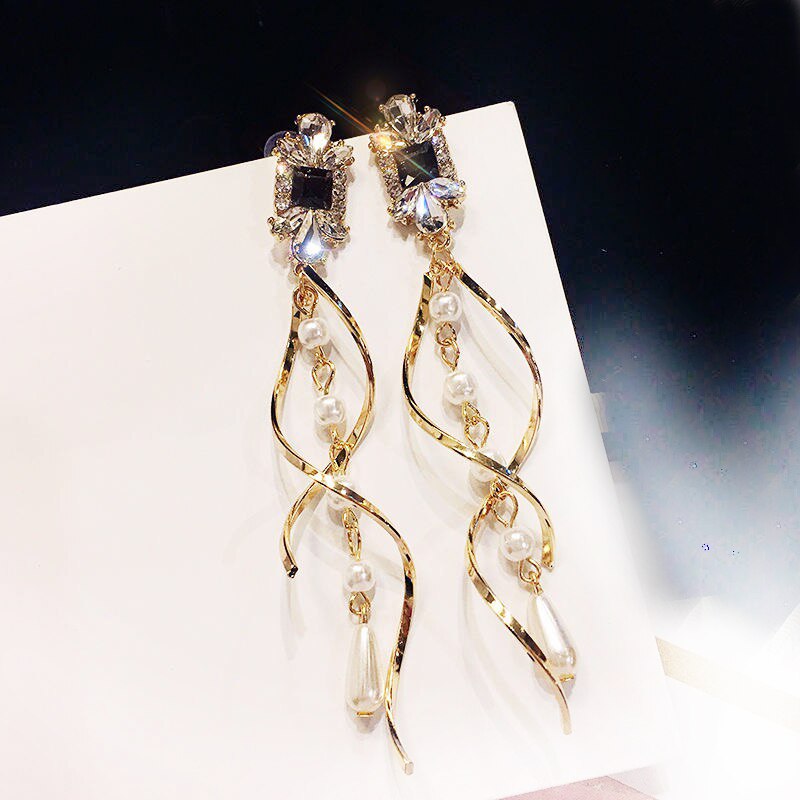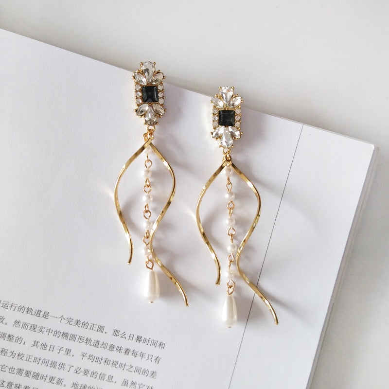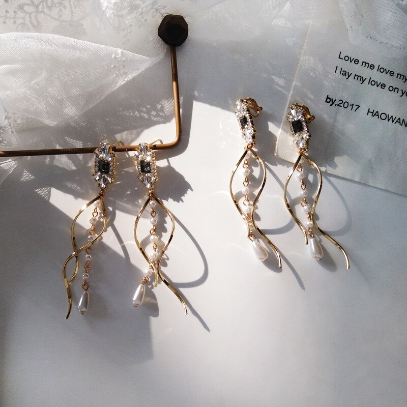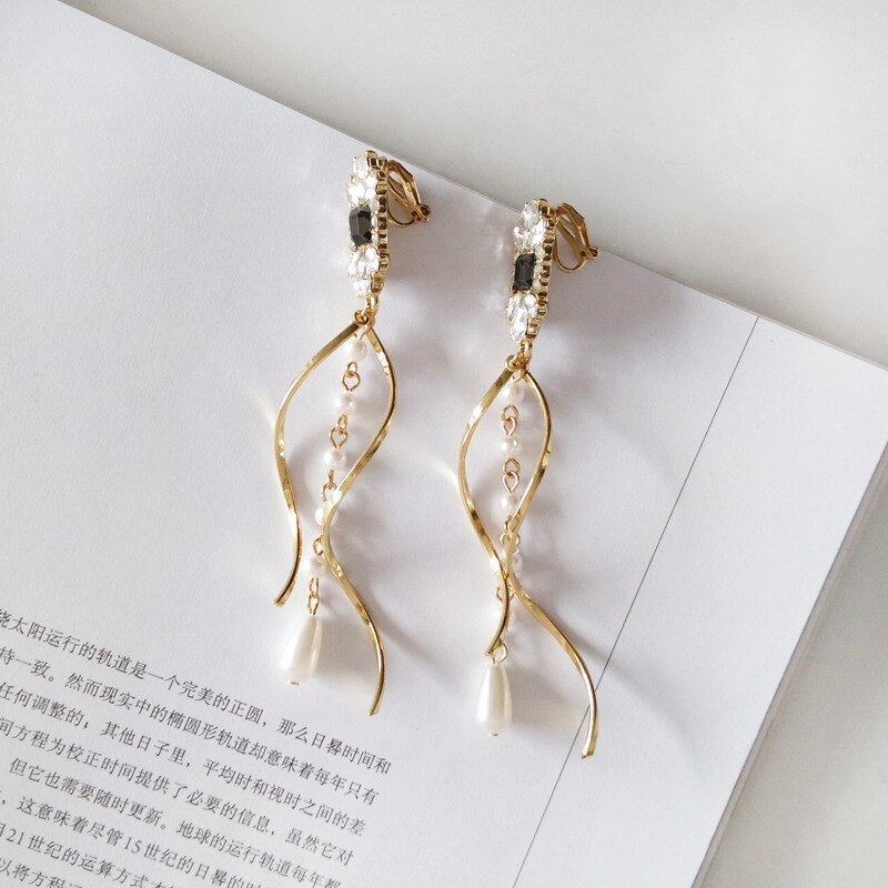 Pendientes de moda: pendientes de clip con perlas barrocas en forma de gota de agua, sin perforación, elegantes pendientes de clip largos con línea curva sin perforación para mujer.