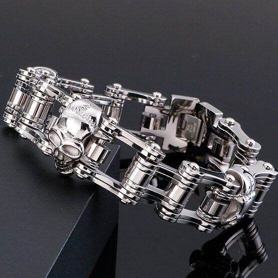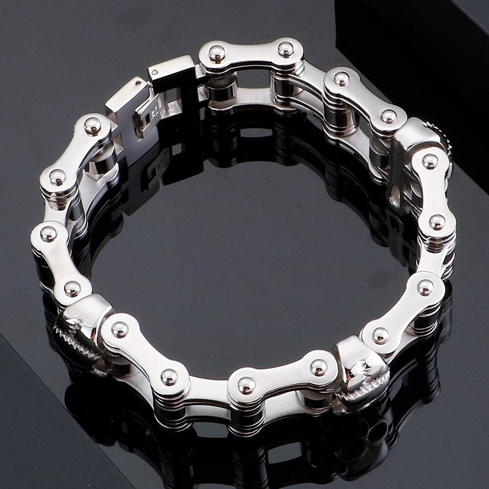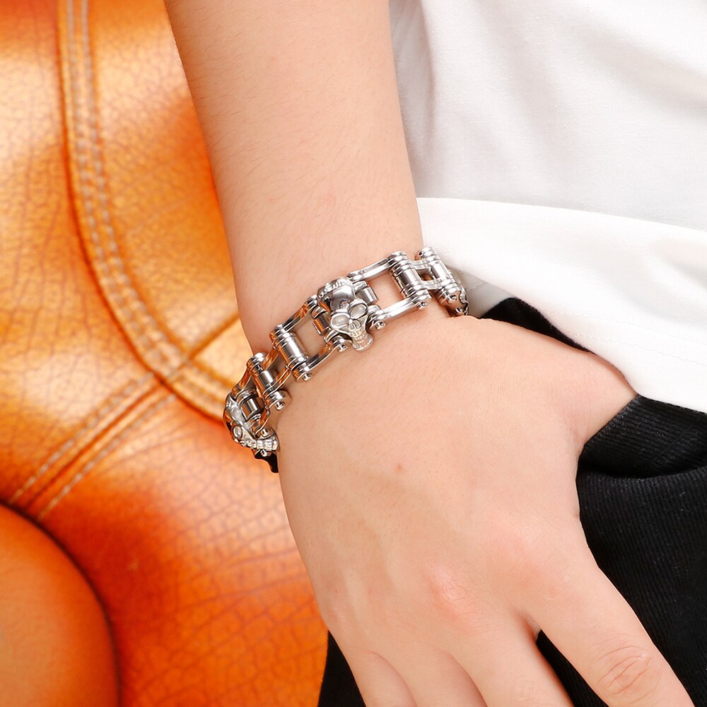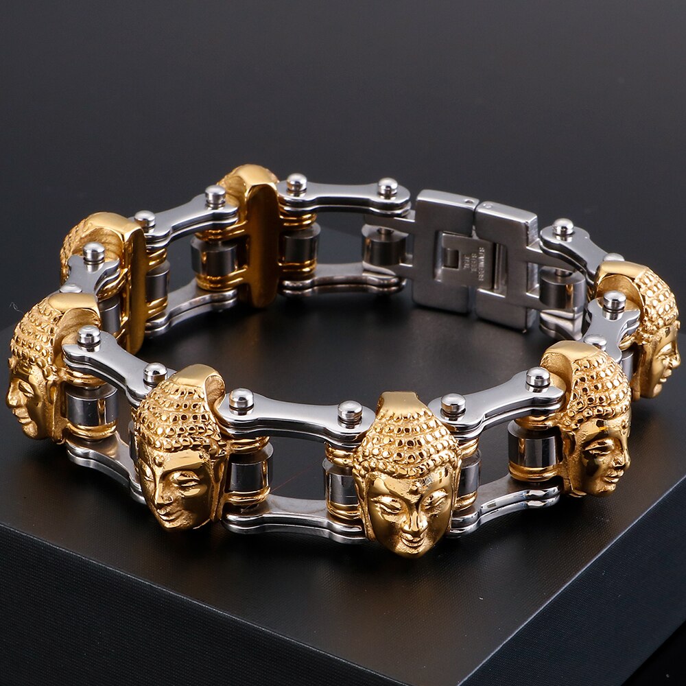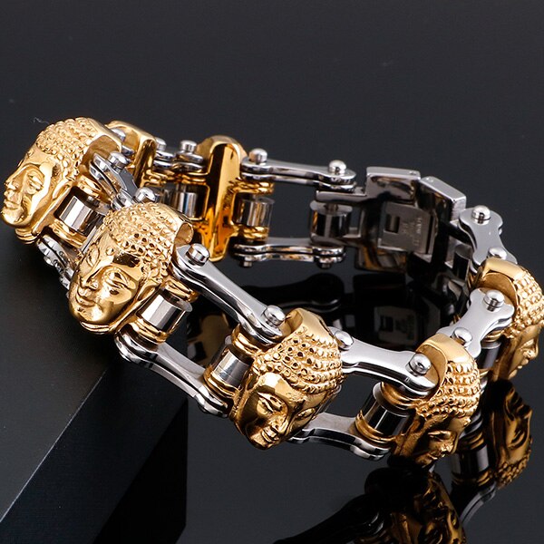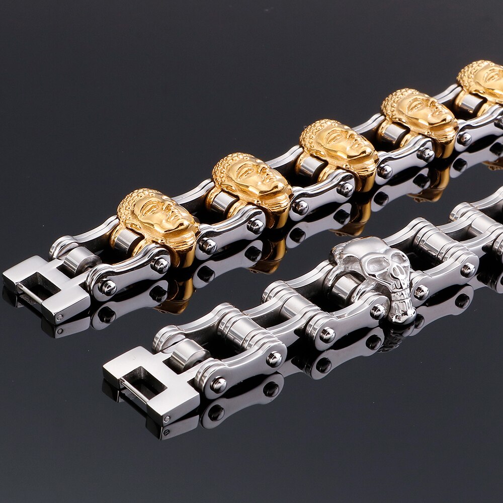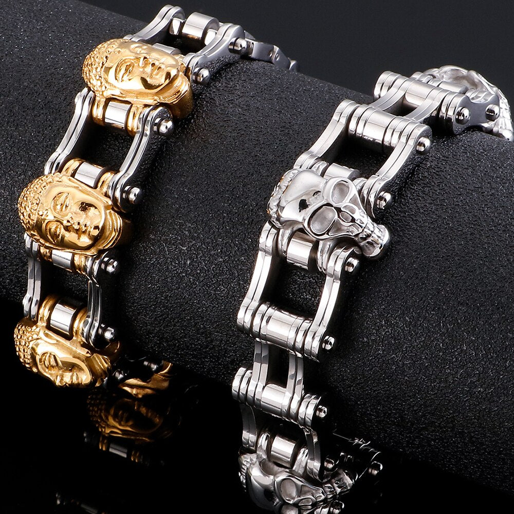 Pulseras de cadena de eslabones de acero inoxidable para hombre, accesorios de bicicleta de gran tamaño, 23 cm de largo, estilo gótico, punk, con calavera y cabeza de Buda.