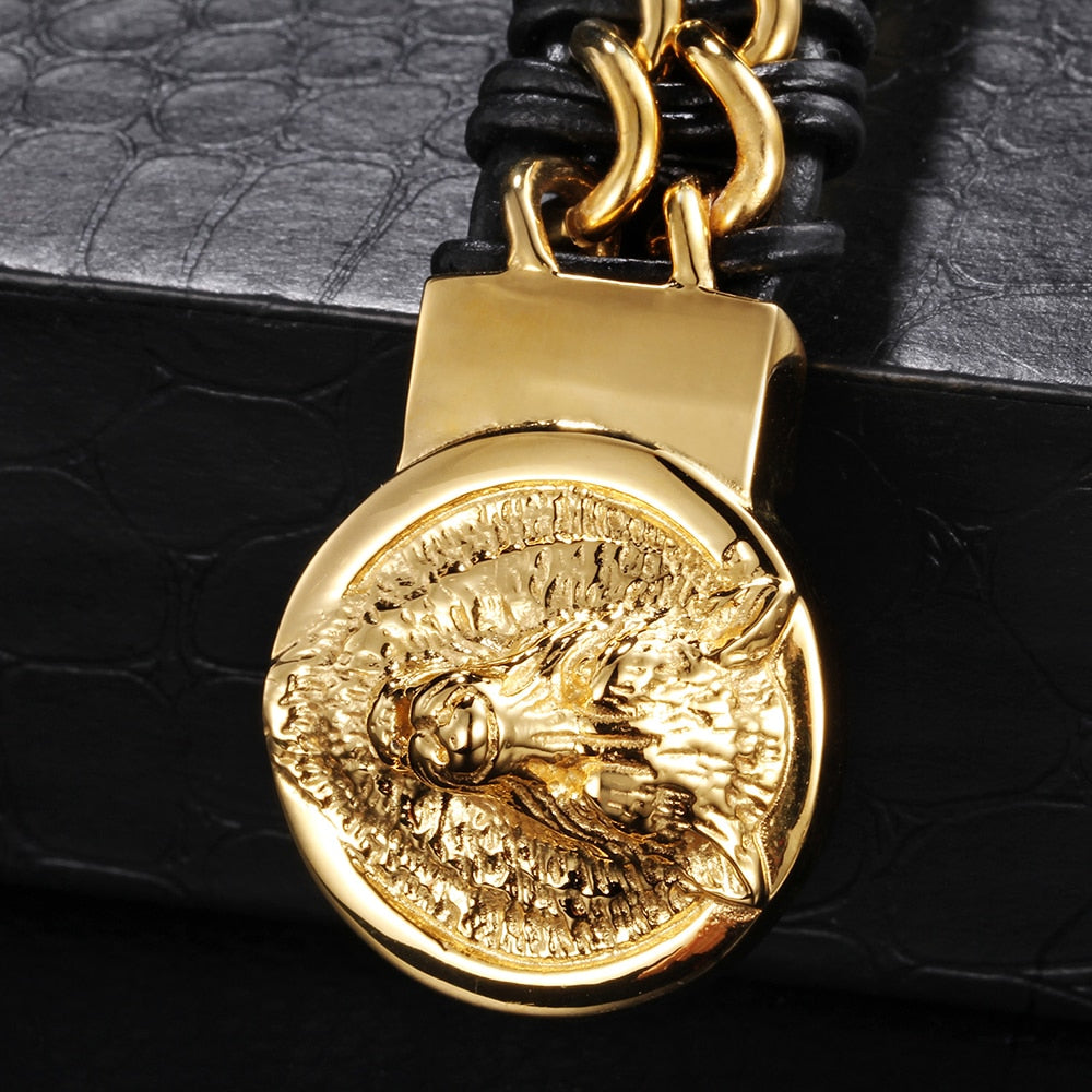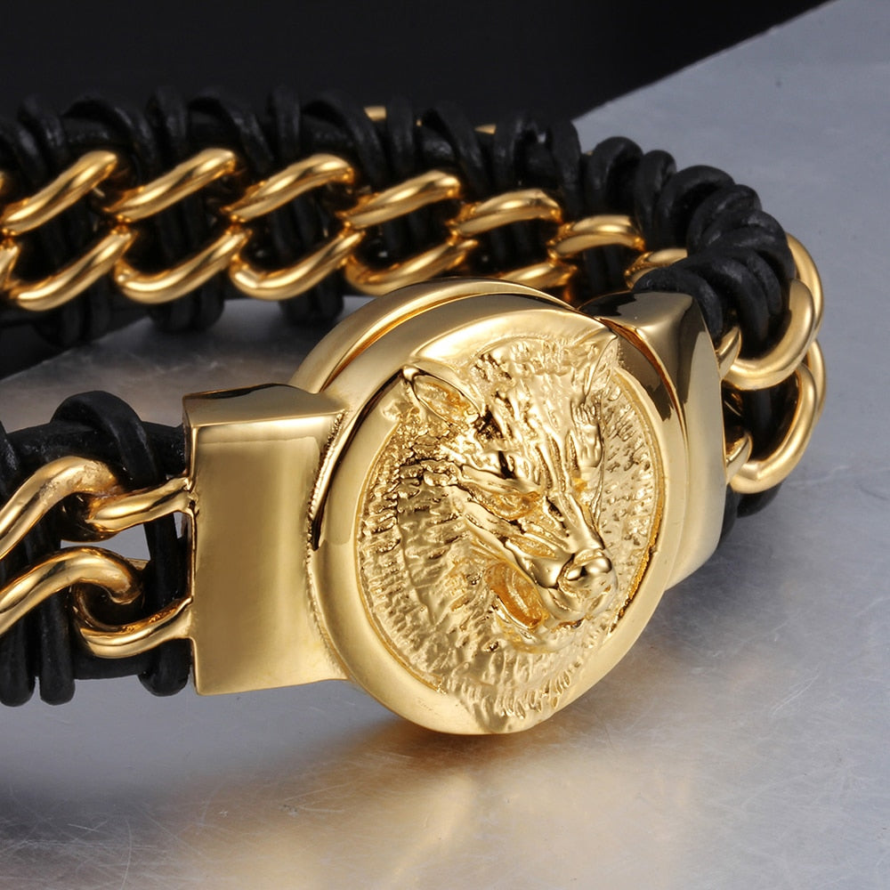 Pulsera de cabeza de lobo de cuero genuino trenzado de acero inoxidable color dorado de Bikers Jewelry