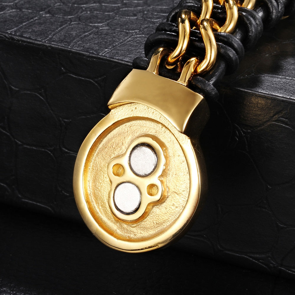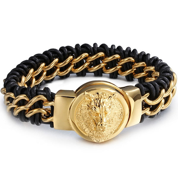 Pulsera de cuero genuino trenzado con cabeza de lobo de acero inoxidable color dorado para hombre, con cierre magnético.