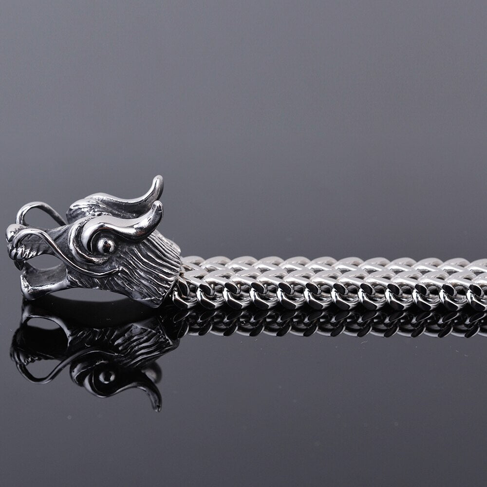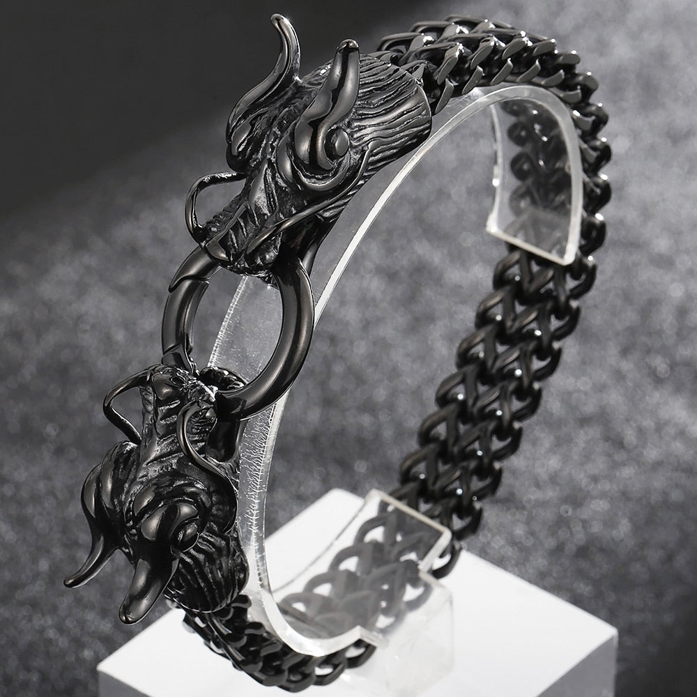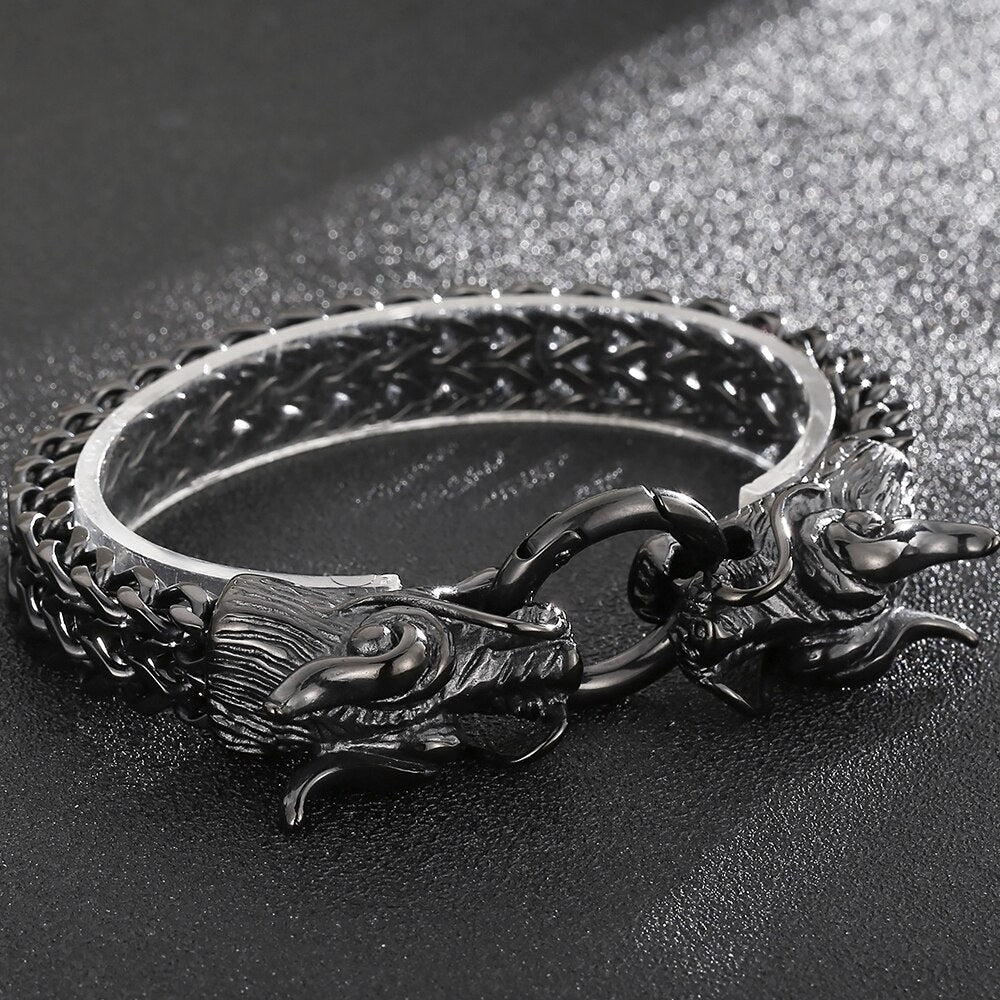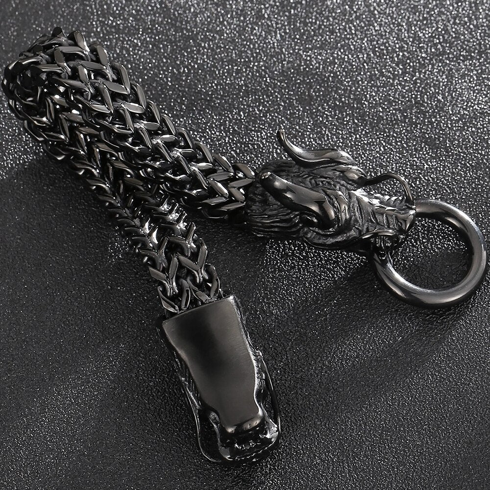 Pulsera de cadena de eslabones cuadrados de acero inoxidable negro con cabeza de dragón y cierre de anillo para motociclistas.