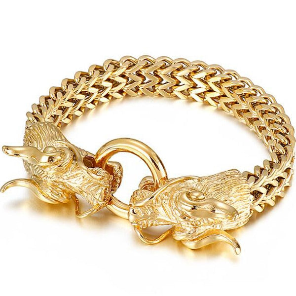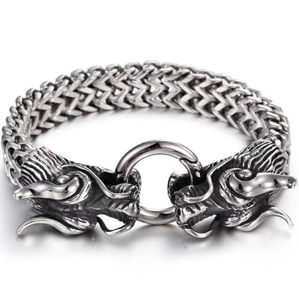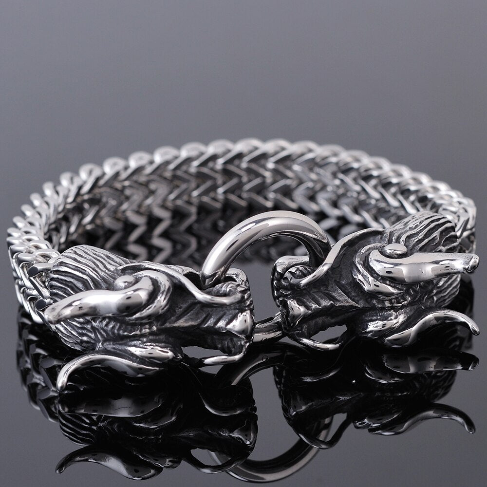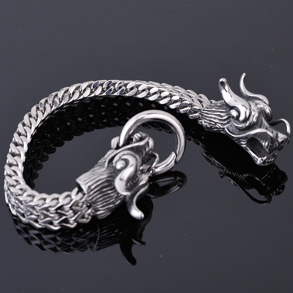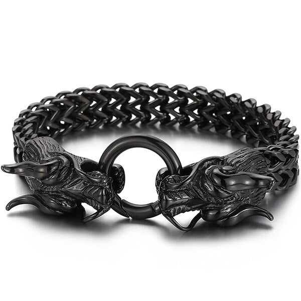 Pulsera de cadena de eslabones cuadrados de acero inoxidable negro con cabeza de dragón y cierre de anillo para motociclistas.