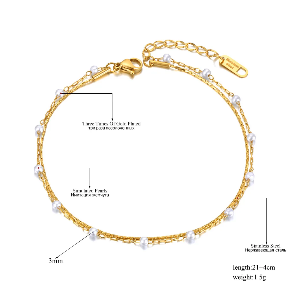 Tobillera bohemia de doble capa con eslabones de cadena de perla blanca para mujer, de acero inoxidable, con cristales de circonita cúbica, joyería para el pie