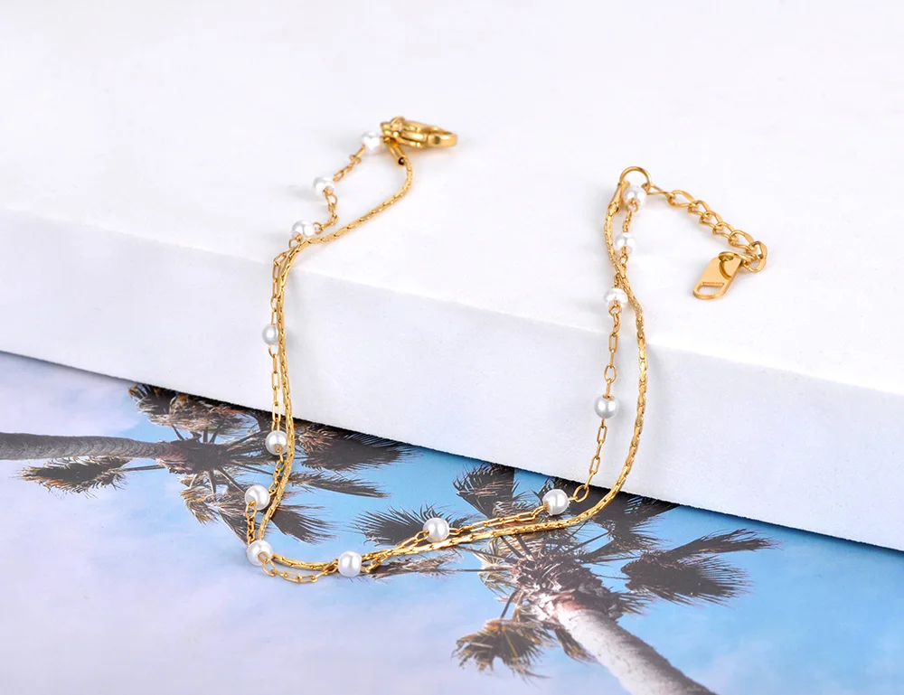 Tobillera bohemia de doble capa con eslabones de cadena y perlas blancas para mujer