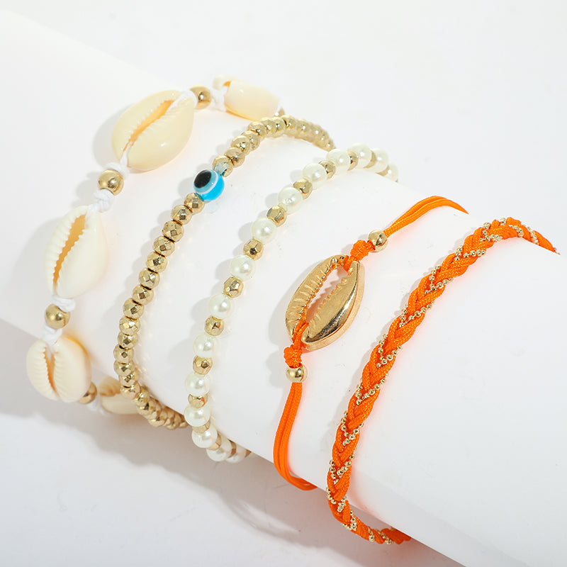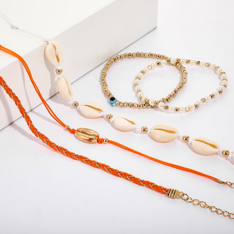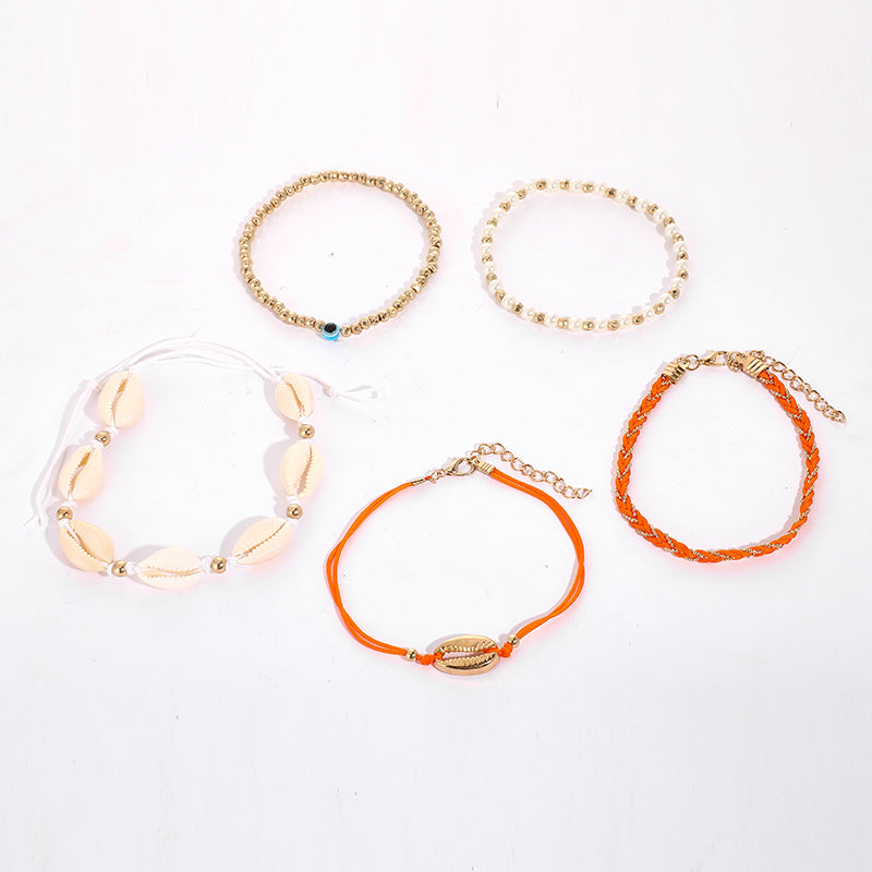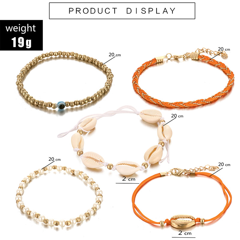 Tobilleras - Juego de 5 tobilleras bohemias con cuentas de concha blanca para mujer, hechas a mano, con cuerda trenzada y múltiples capas, joyería para el pie.