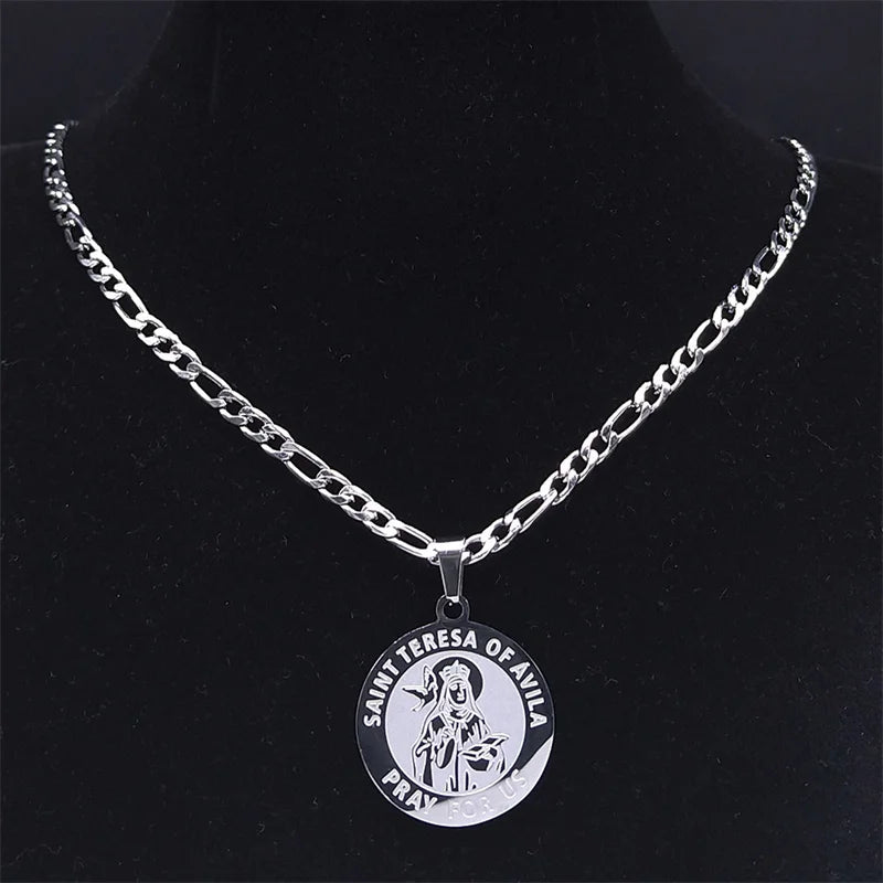 Collar de acero inoxidable con la patrona católica Santa Teresa de Ávila para mujeres y hombres. Ruega por nosotros. Color plata. Collares de protección. Joyería.