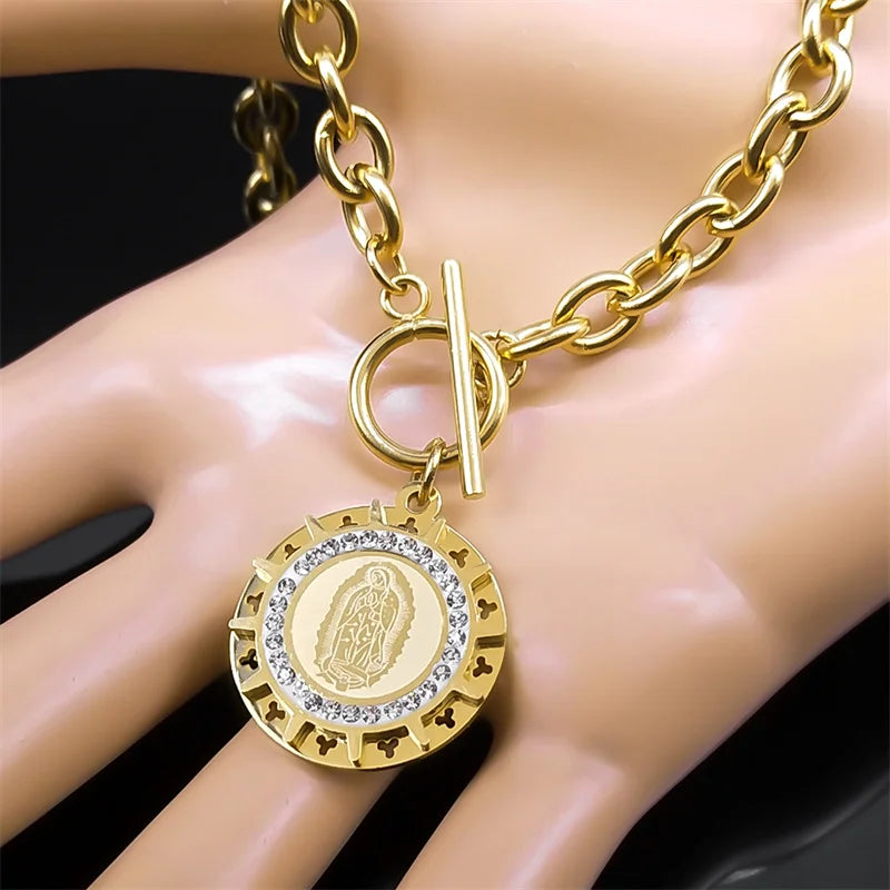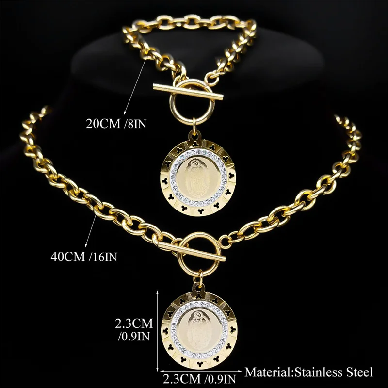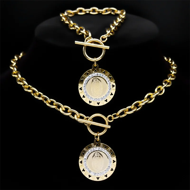 Pulsera con medalla de la Virgen María católica, collar para mujer y hombre, acero inoxidable, cadena gruesa para clavícula, conjunto de joyas