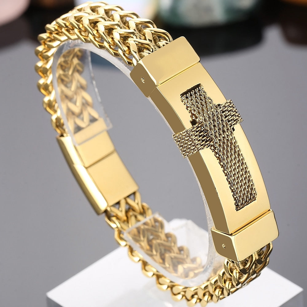 Pulsera de cruz cristiana para hombre, de acero inoxidable chapado en oro.