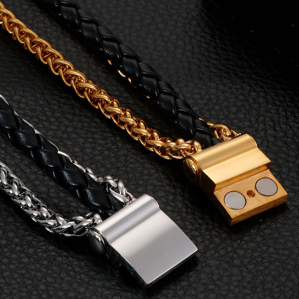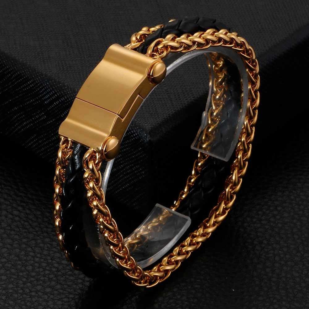 Pulsera clásica de cuero trenzado para hombre, con eslabones de cadena de acero inoxidable chapados en oro.
