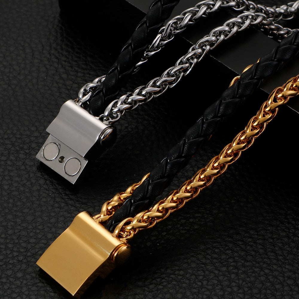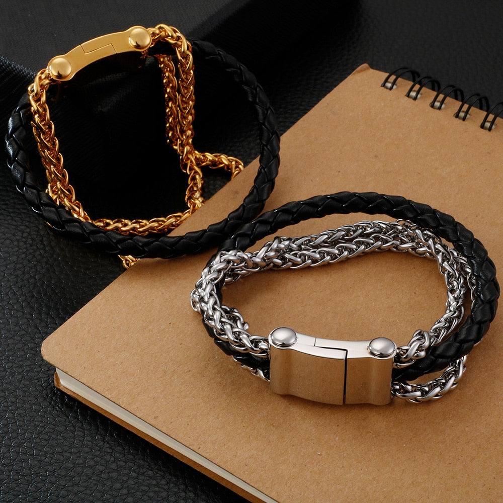 Pulsera clásica de cuero trenzado para hombre, con eslabones de cadena de acero inoxidable chapados en oro, pulseras y brazaletes para hombre, pulsera envolvente, joyería.