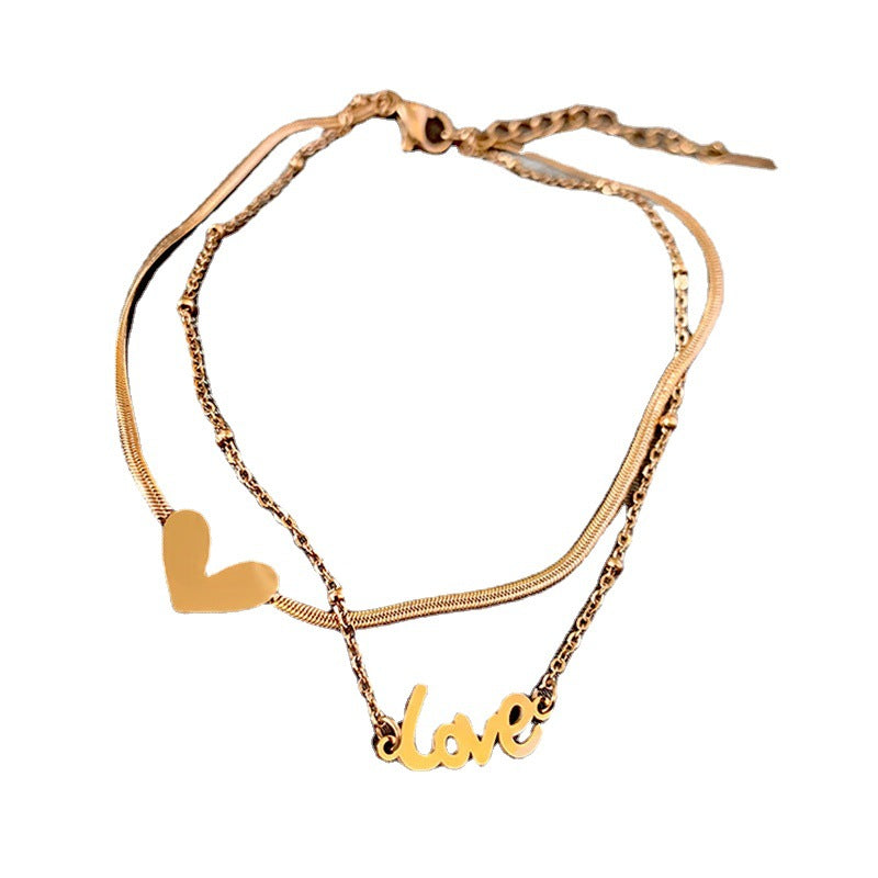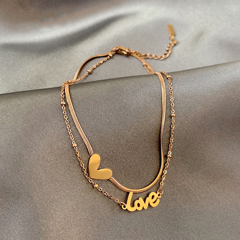 Tobilleras clásicas de acero y titanio con forma de corazón y letras de amor de doble capa para mujer. Joyería de moda coreana que no se decolora.