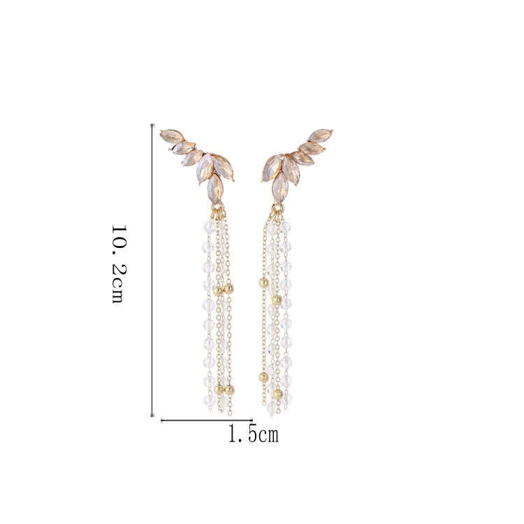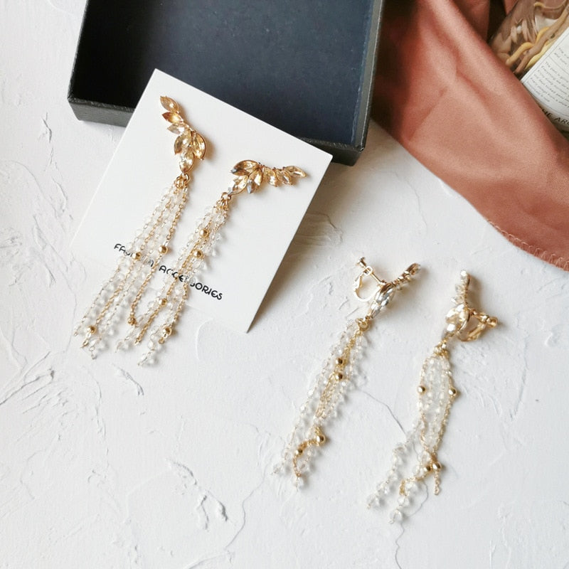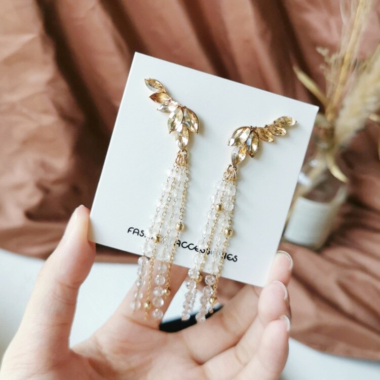 Pendientes de moda con clip, sin perforaciones, con alas de ángel, largos, con borlas de cristal, para mujer y novia.