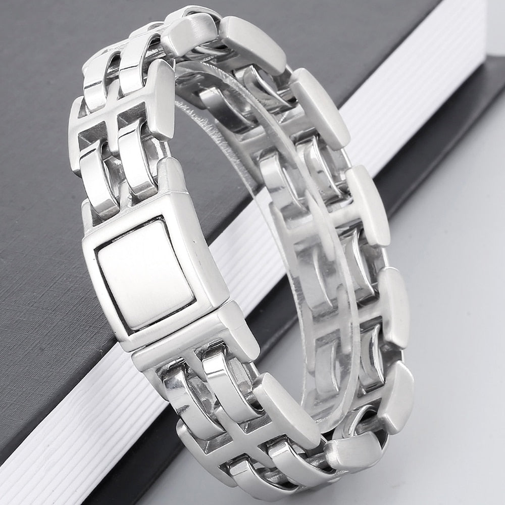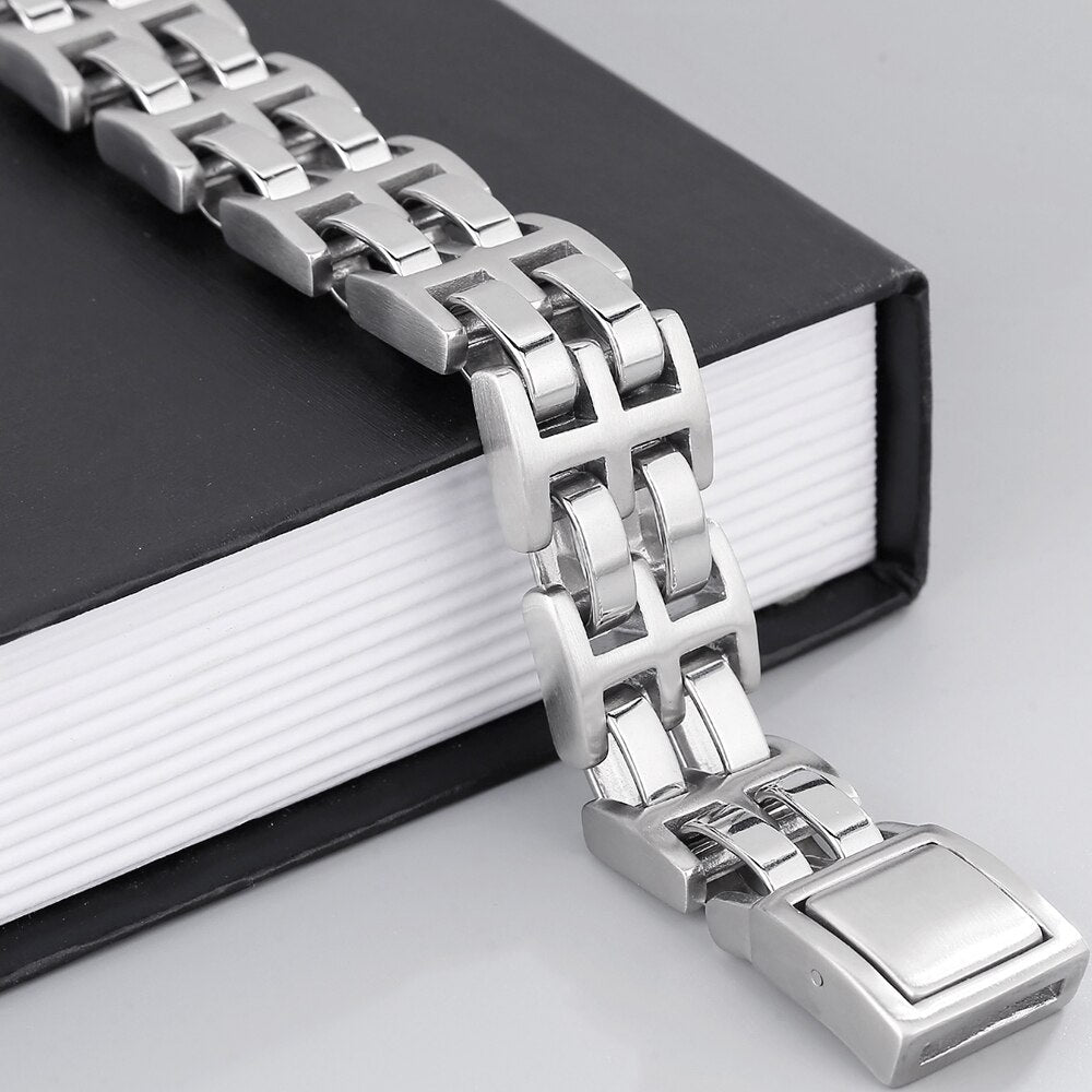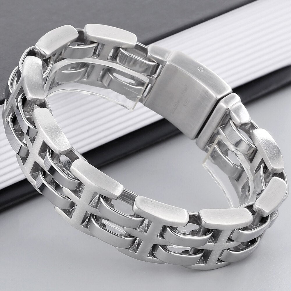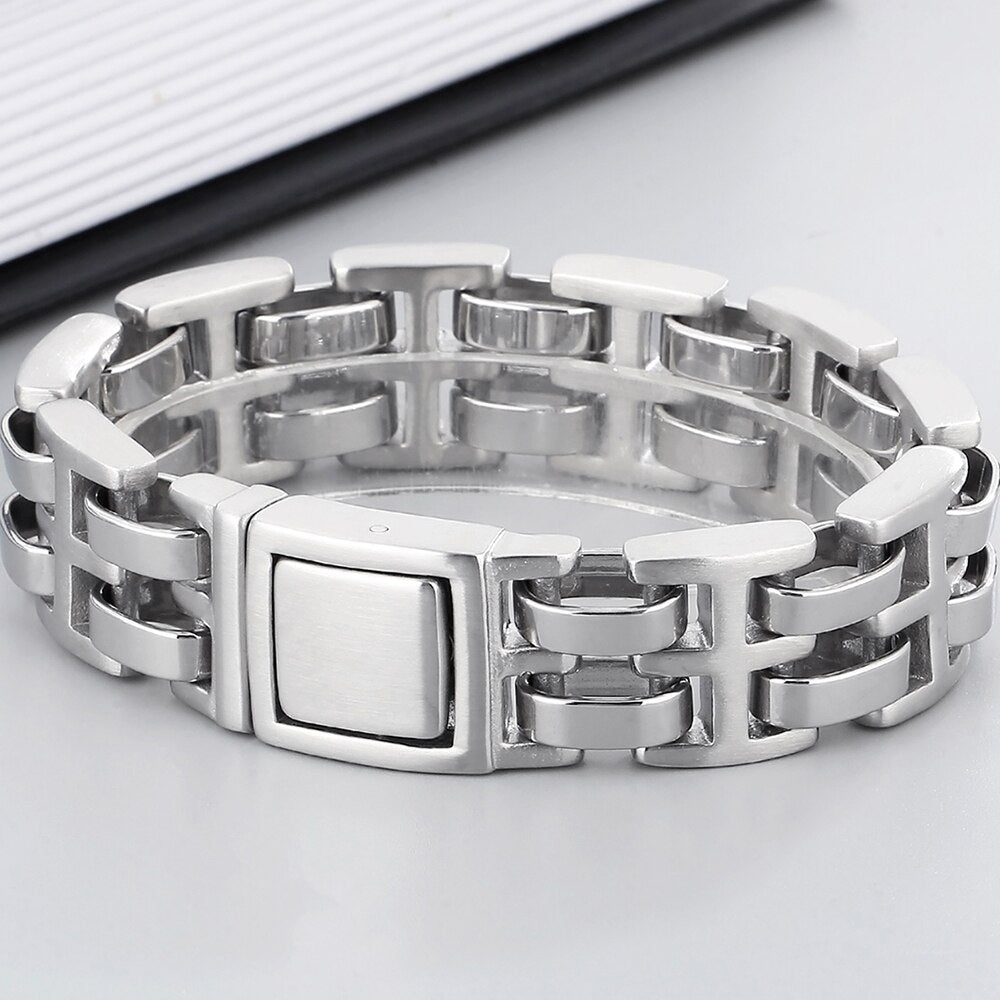Pulsera de hombre moderna de acero inoxidable con cadena de eslabones de doble fila.