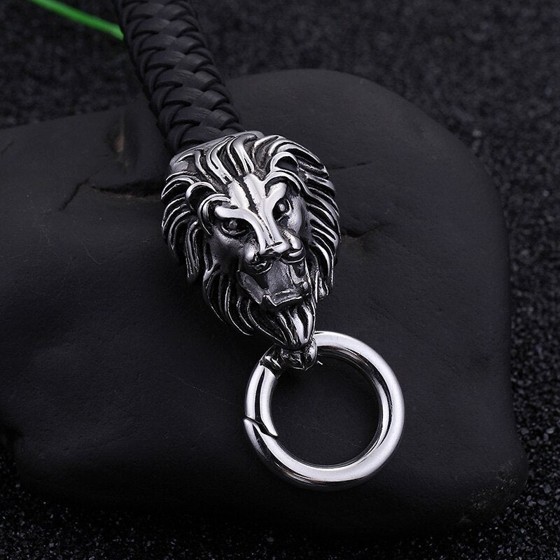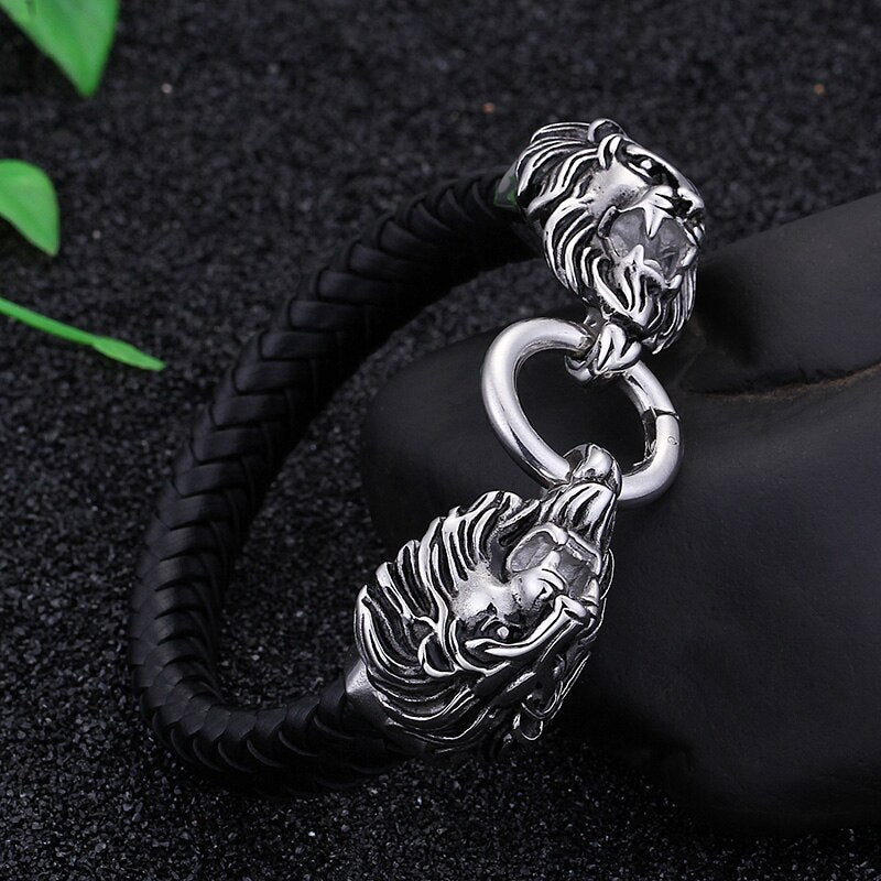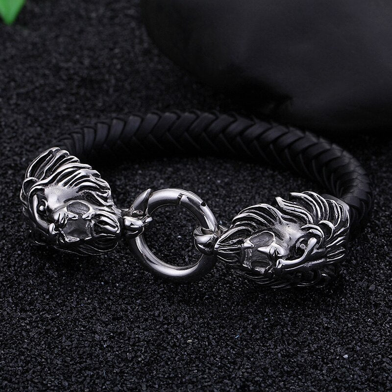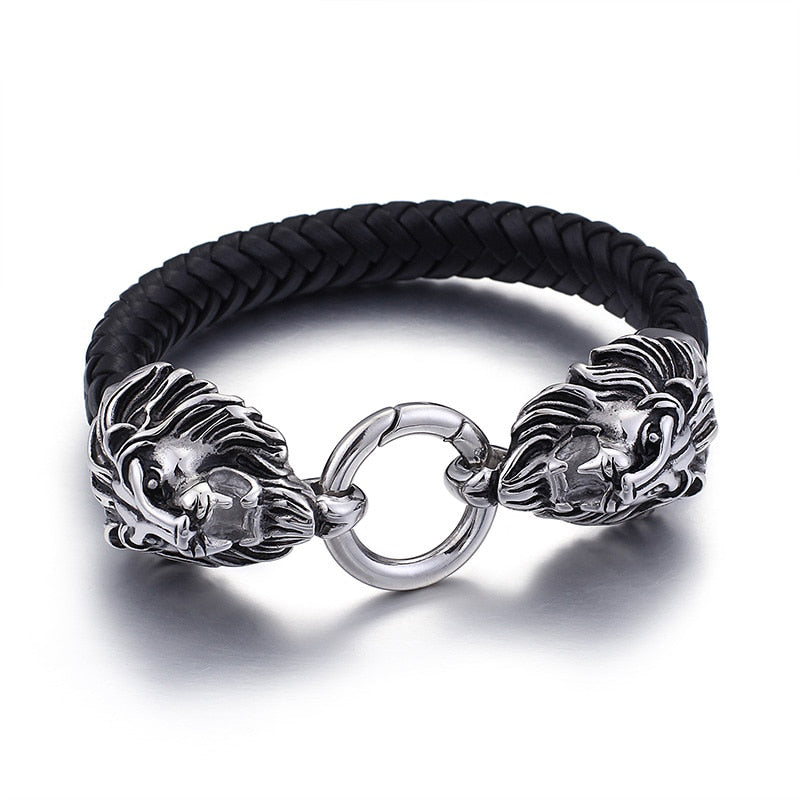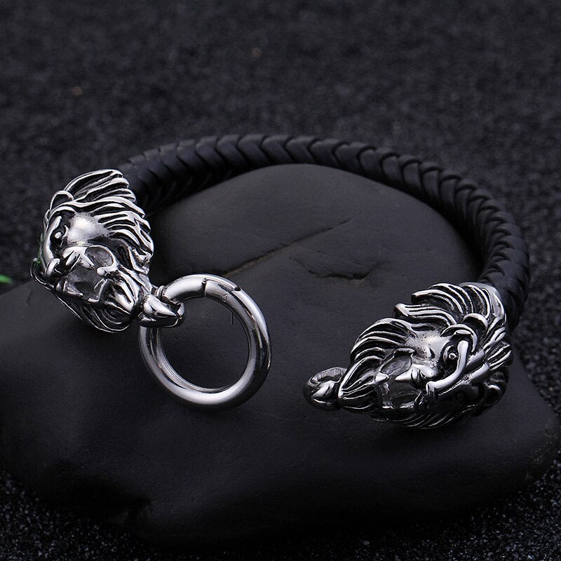 Pulsera de acero inoxidable de piel de vaca para hombre, joyería gótica con doble cabeza de león y correa de cuero envolvente, pulseras y brazaletes para hombre