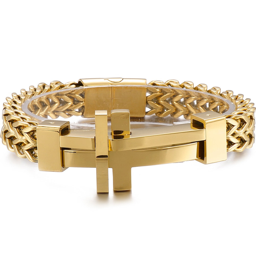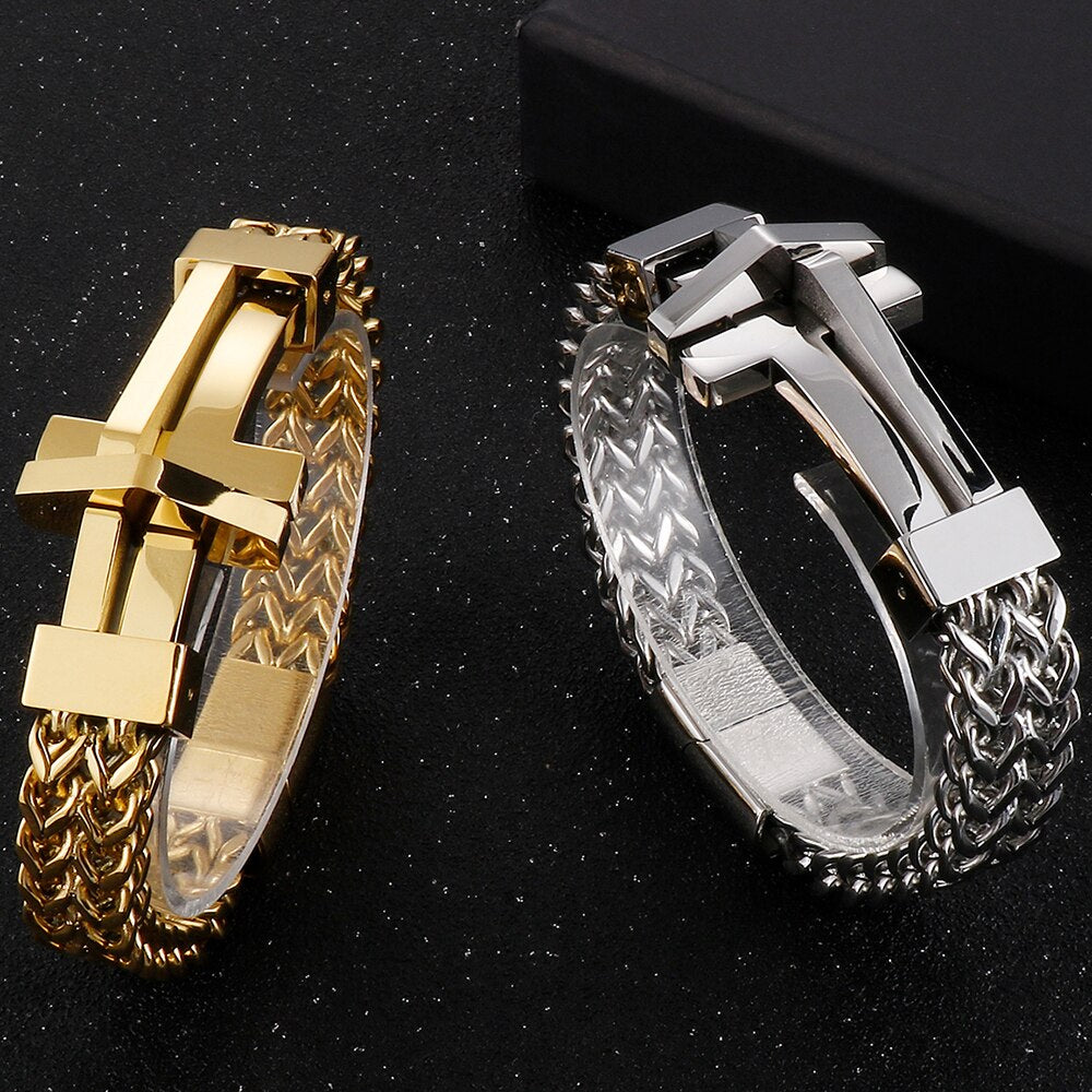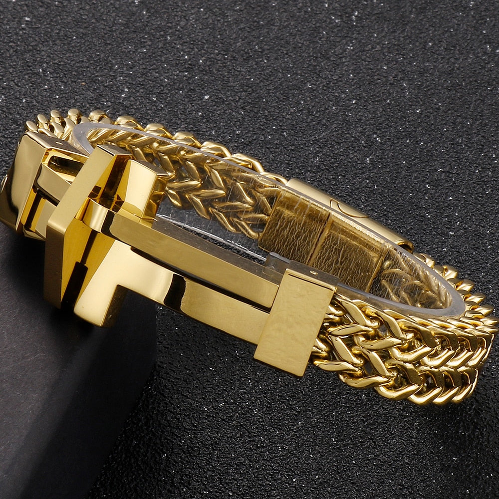 Pulsera de acero inoxidable con eslabones cruzados, chapada en oro pulido, color negro mate.