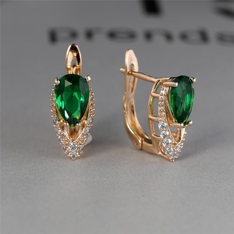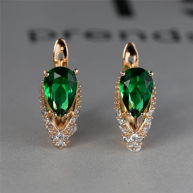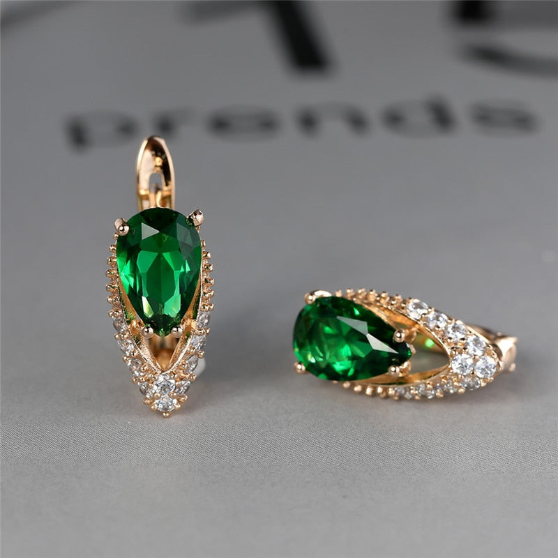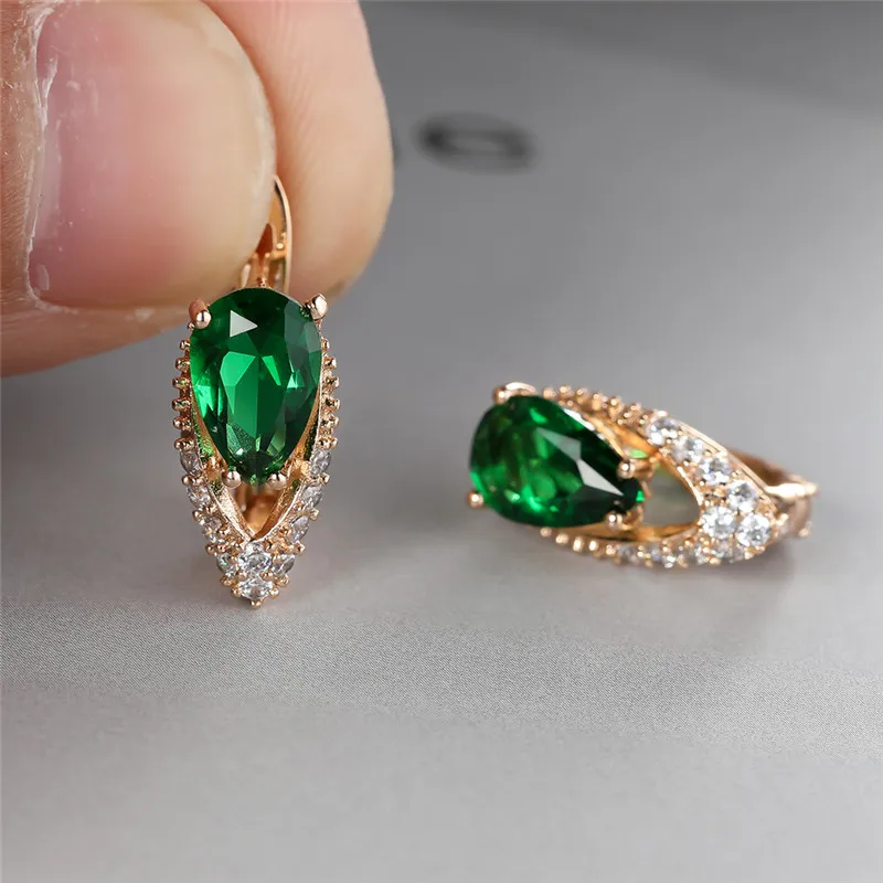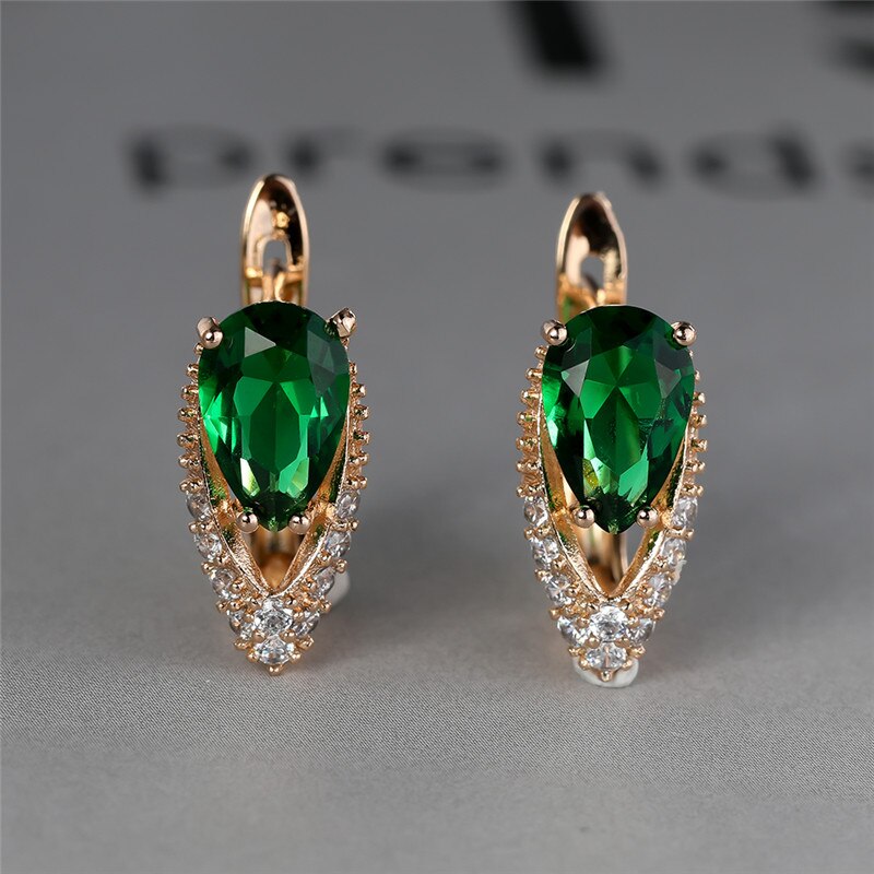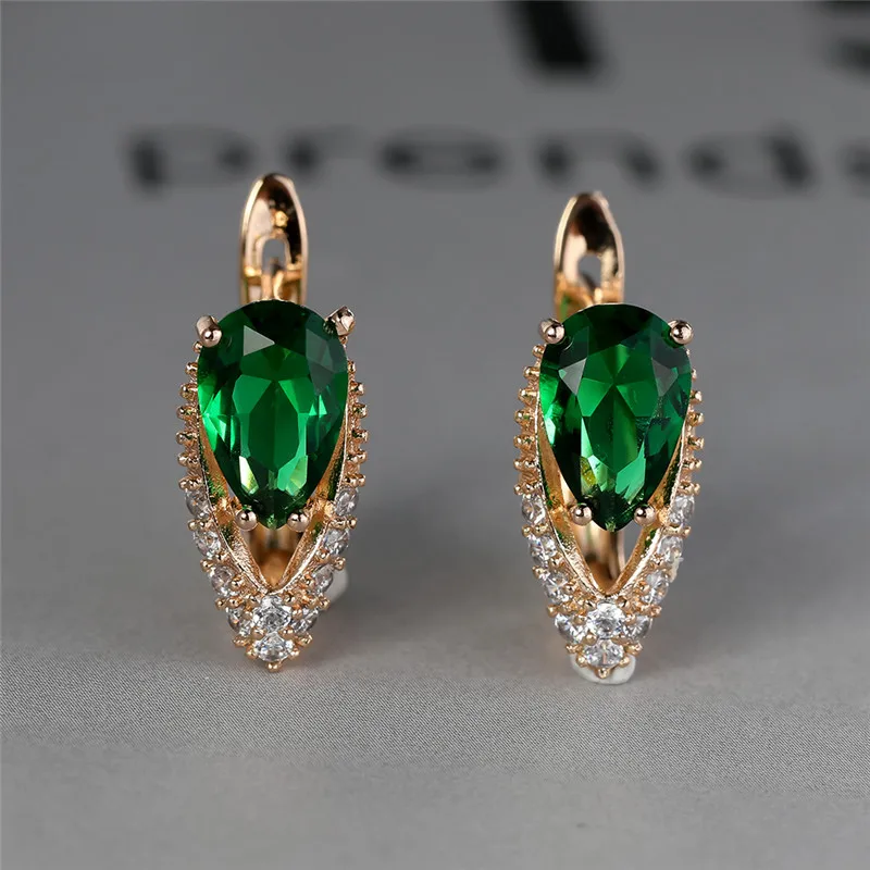 Lindos pendientes femeninos de piedra de circonita verde con dije de color dorado, pequeños pendientes de clip