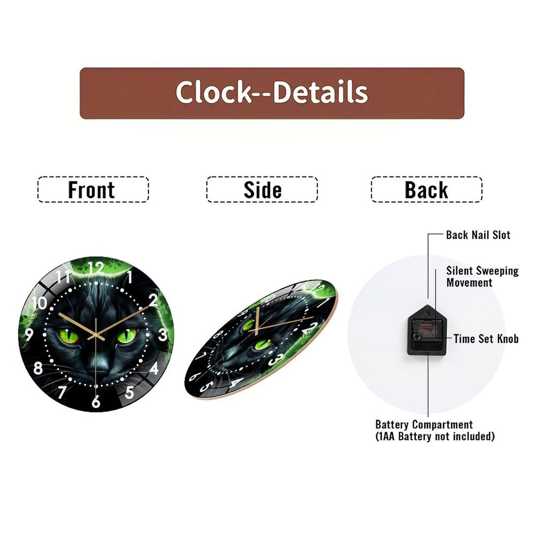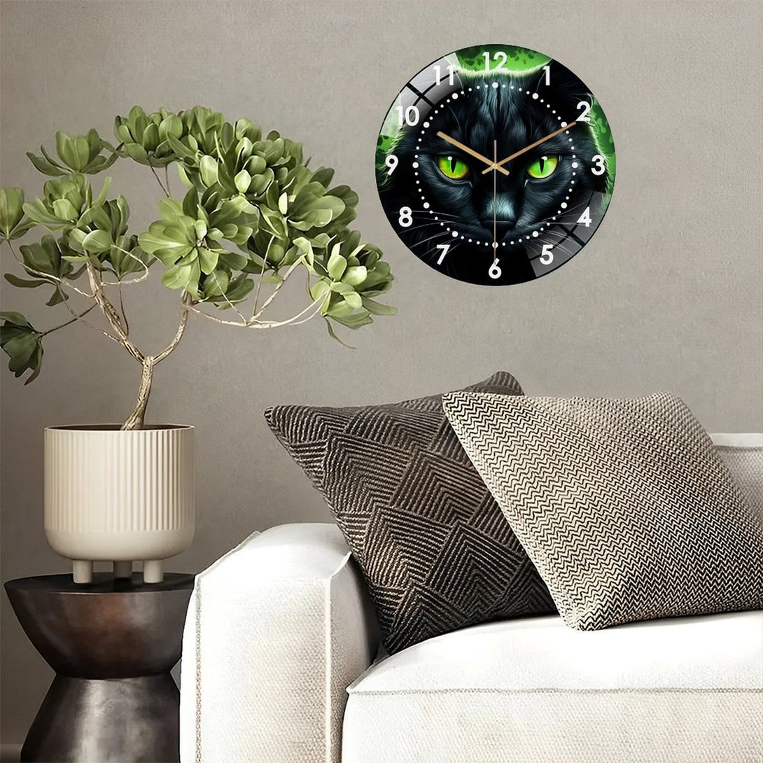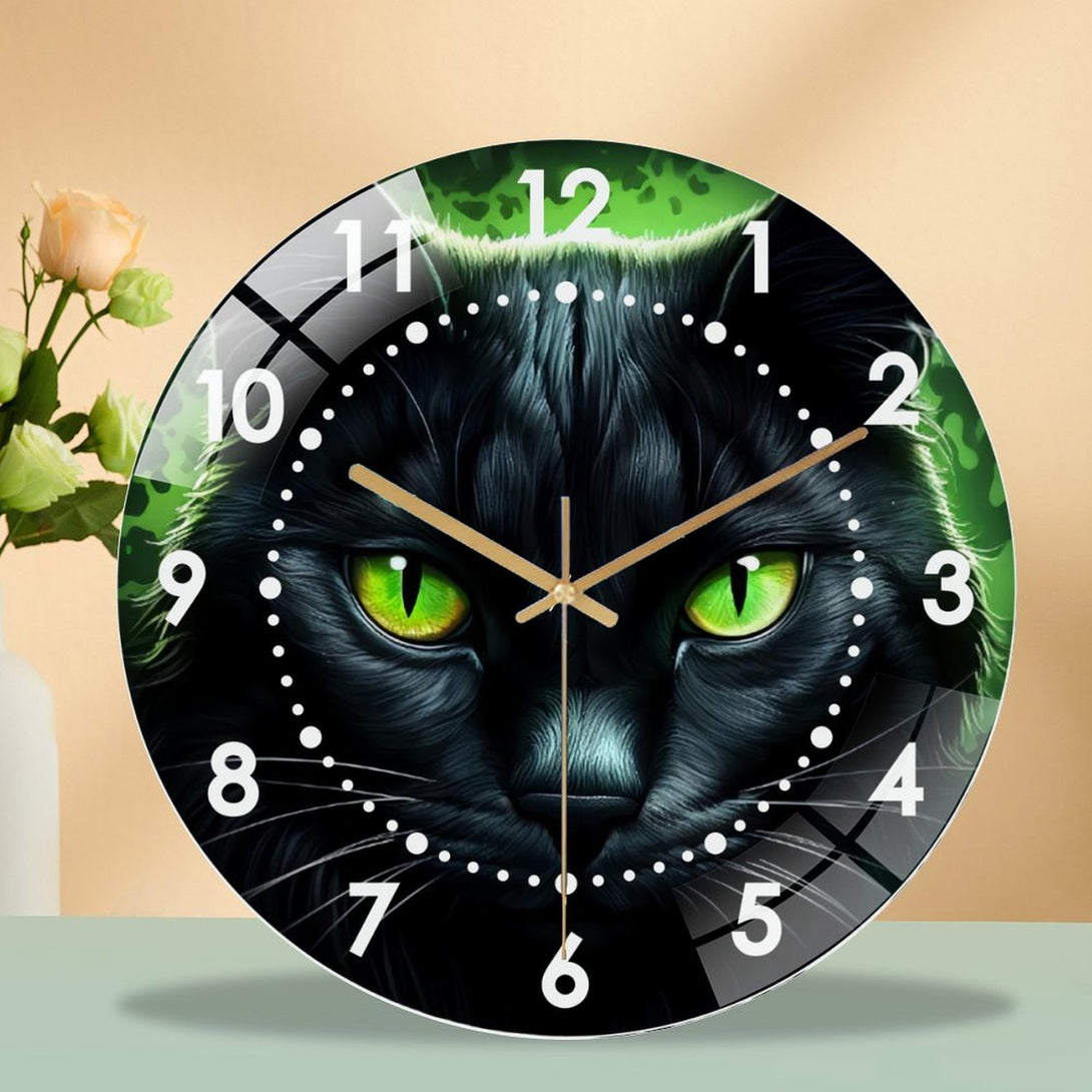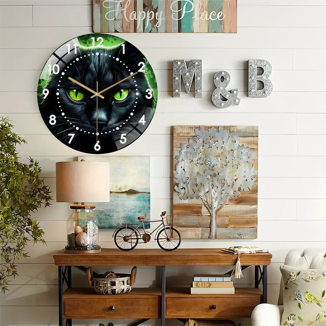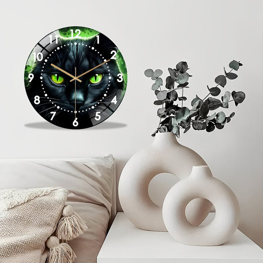 Decor Wall Clock: Black Cat Face Glass Wall Clock,Black Cat Hall-ween Decor Wall Clock for Homes, Bars, Offices, Man Caves, Garages, And Living Rooms .Also Makes A Great Gift.