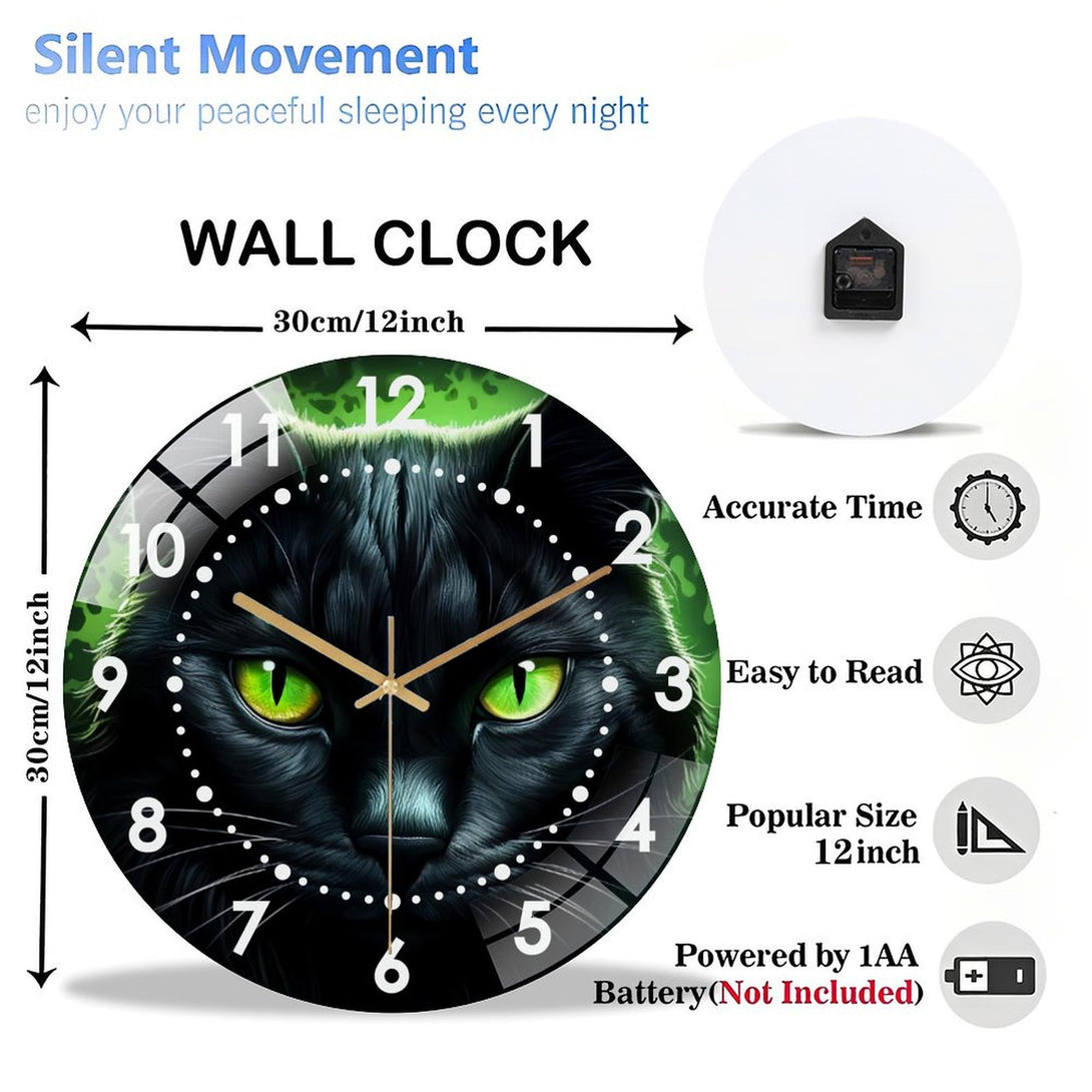 Black Cat Face Glass Wall Clock,Black Cat Hall-ween Decor Wall Clock for Homes, Bars, Offices, Man Caves, Garages, And Living Rooms .Also Makes A Great Gift.,12×12inch(30×30cm)