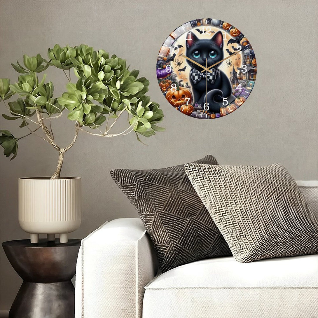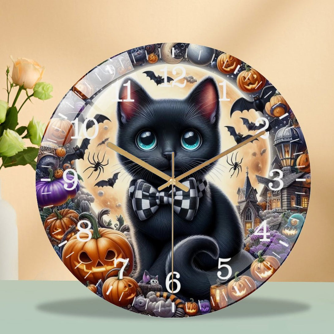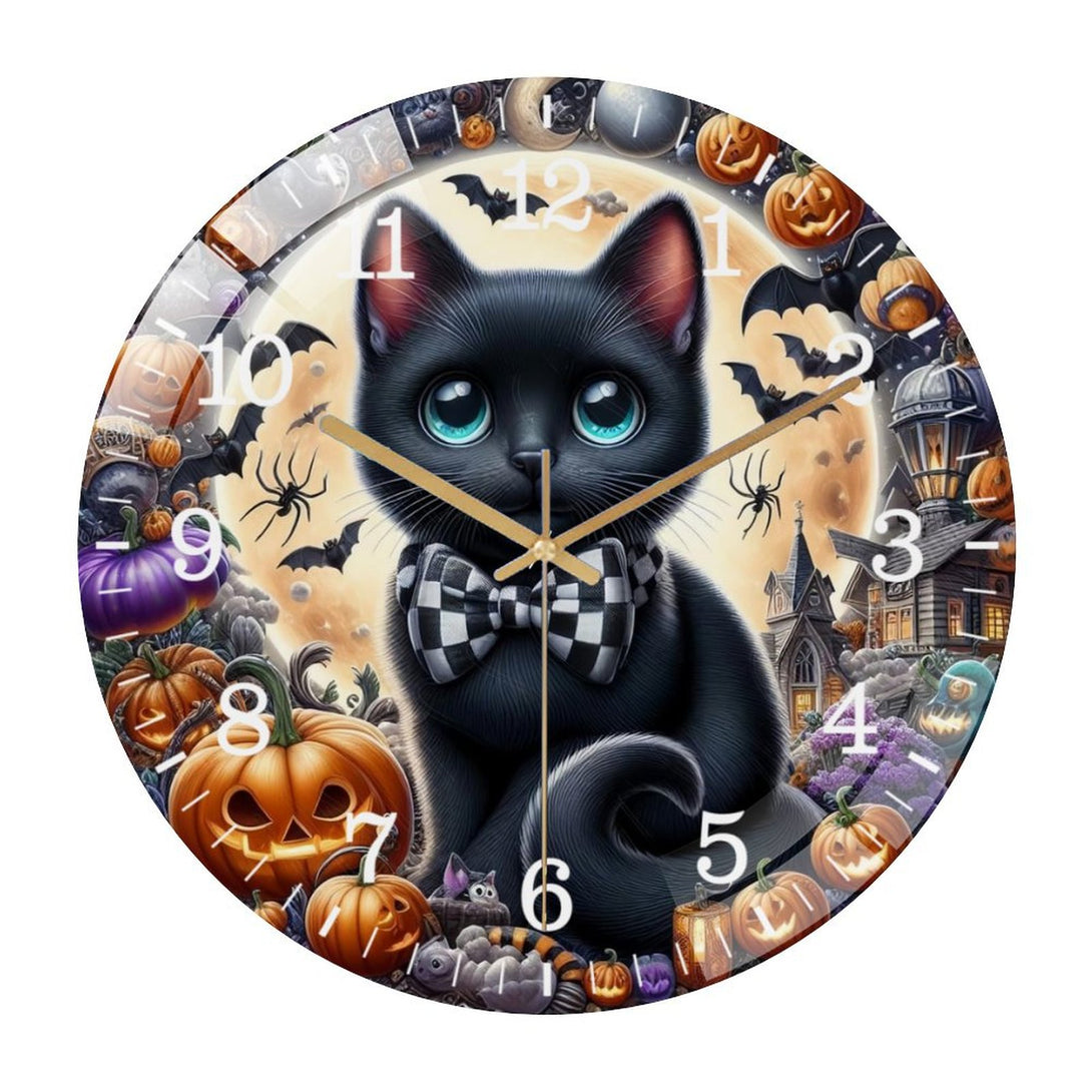 Decor Wall Clock: Black Kitty with Bow Tie Hallo-ween Glass Wall Clock, Funny Cat Decor Wall Clock for Homes, Bars, Offices, Man Caves, Garages, And Living Rooms .Also Makes A Great Gift.