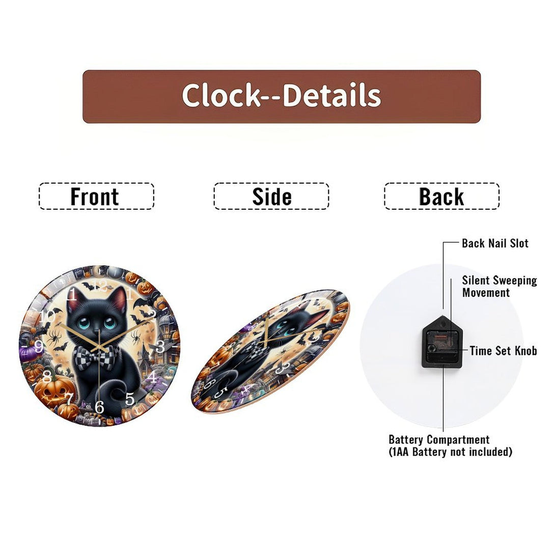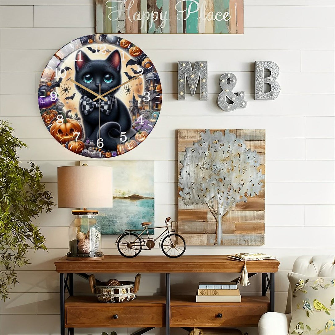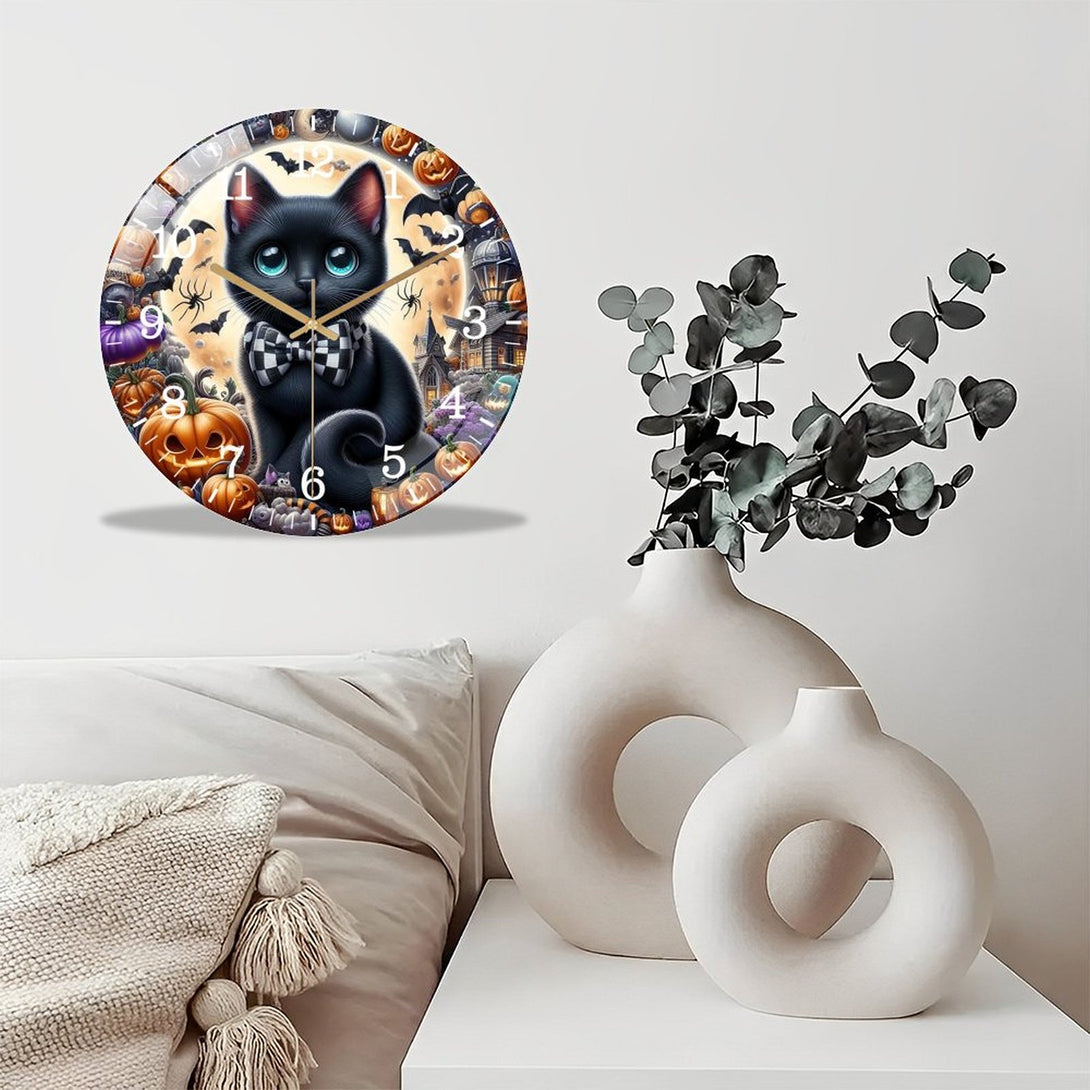 Decor Wall Clock: Black Kitty with Bow Tie Hallo-ween Glass Wall Clock, Funny Cat Decor Wall Clock for Homes, Bars, Offices, Man Caves, Garages, And Living Rooms .Also Makes A Great Gift.