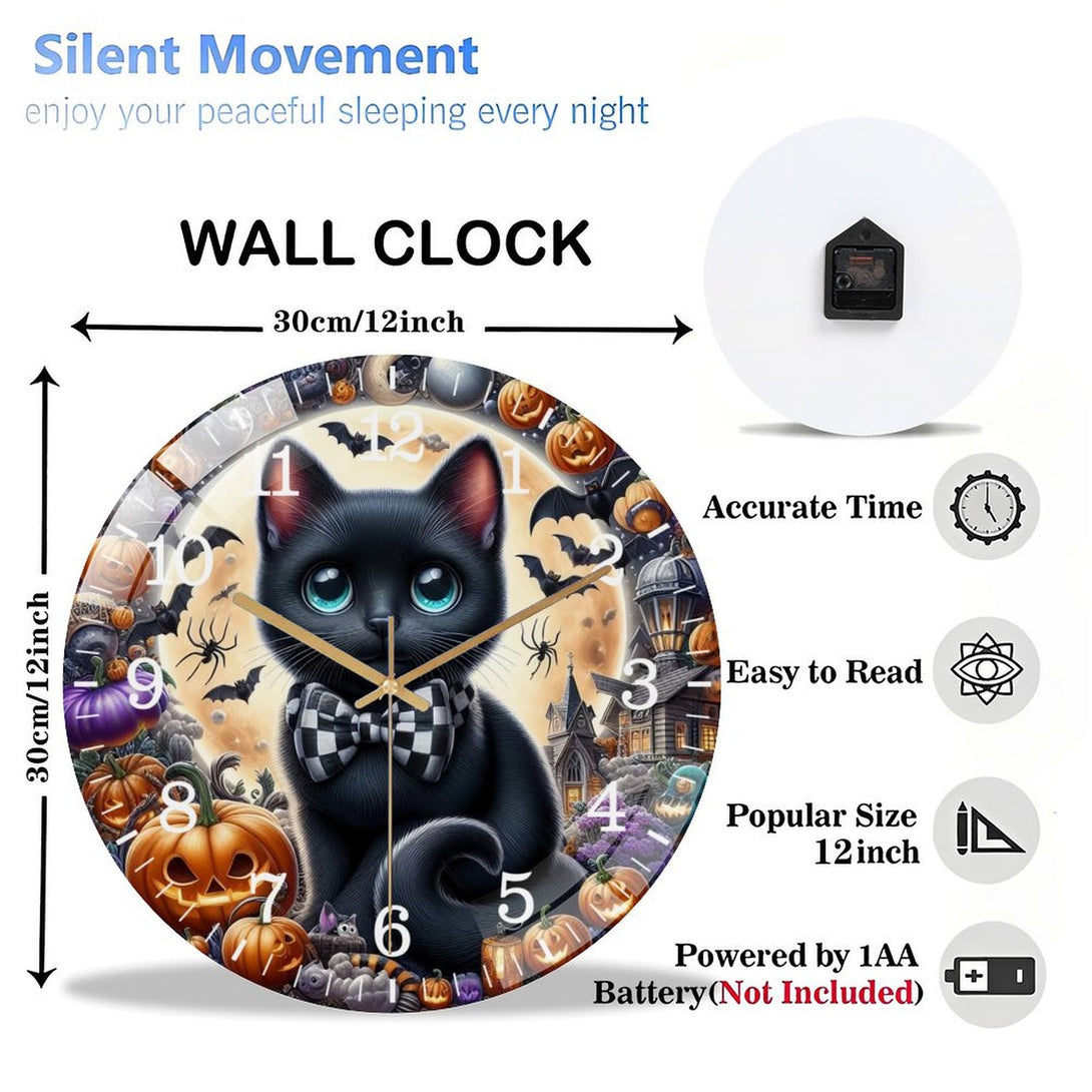 Black Kitty with Bow Tie Hallo-ween Glass Wall Clock, Funny Cat Decor Wall Clock for Homes, Bars, Offices, Man Caves, Garages, And Living Rooms .Also Makes A Great Gift.,12×12inch(30×30cm)