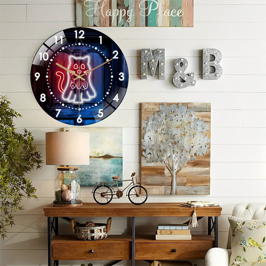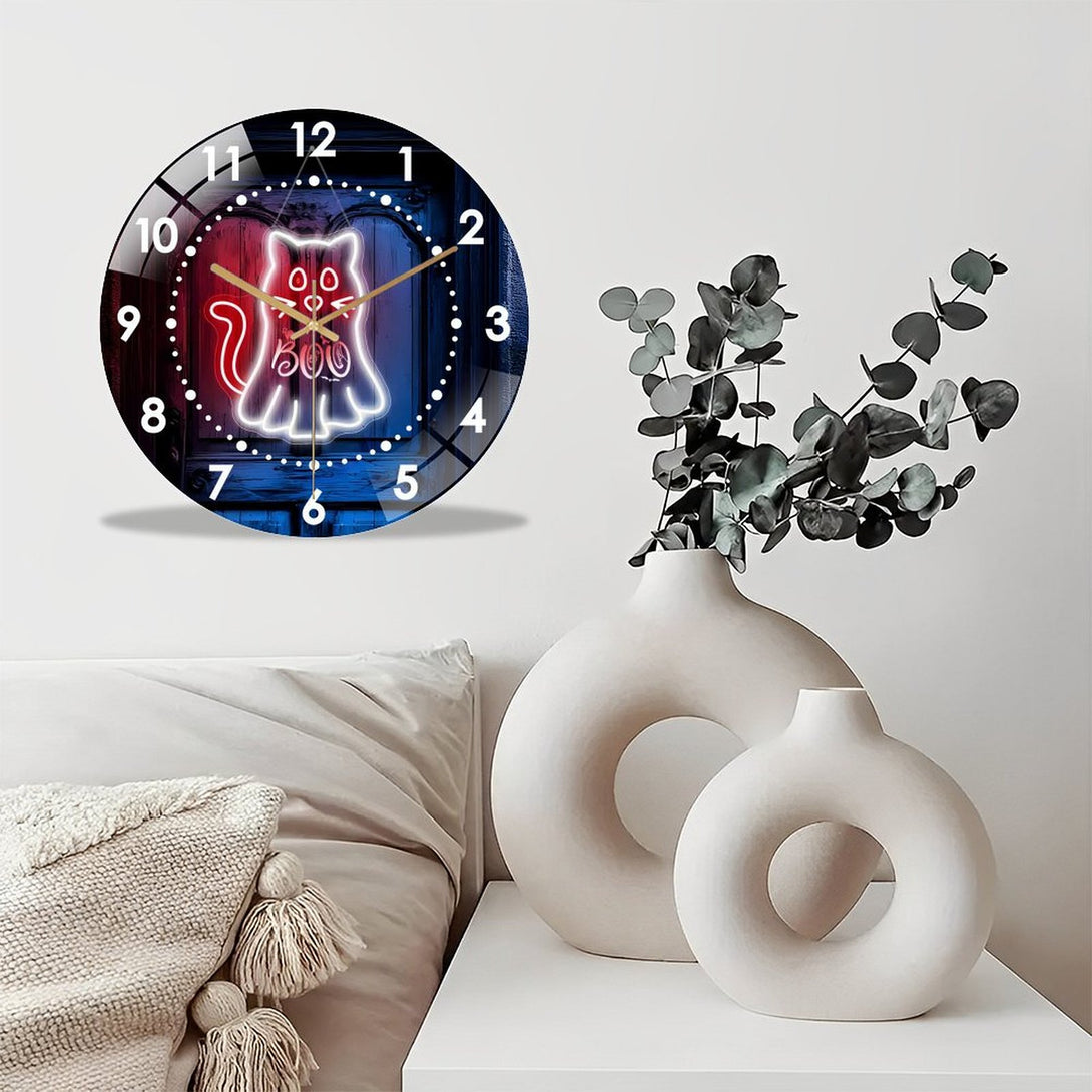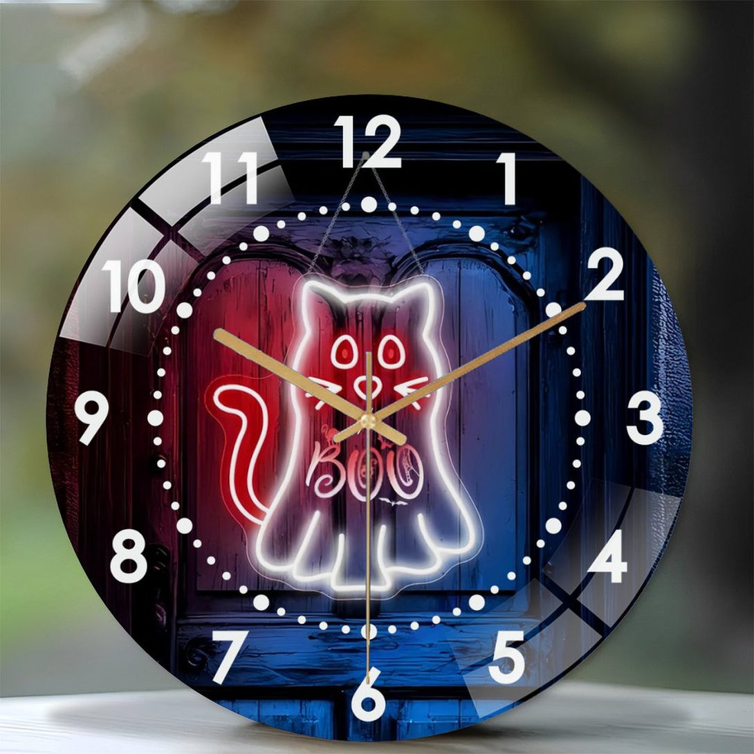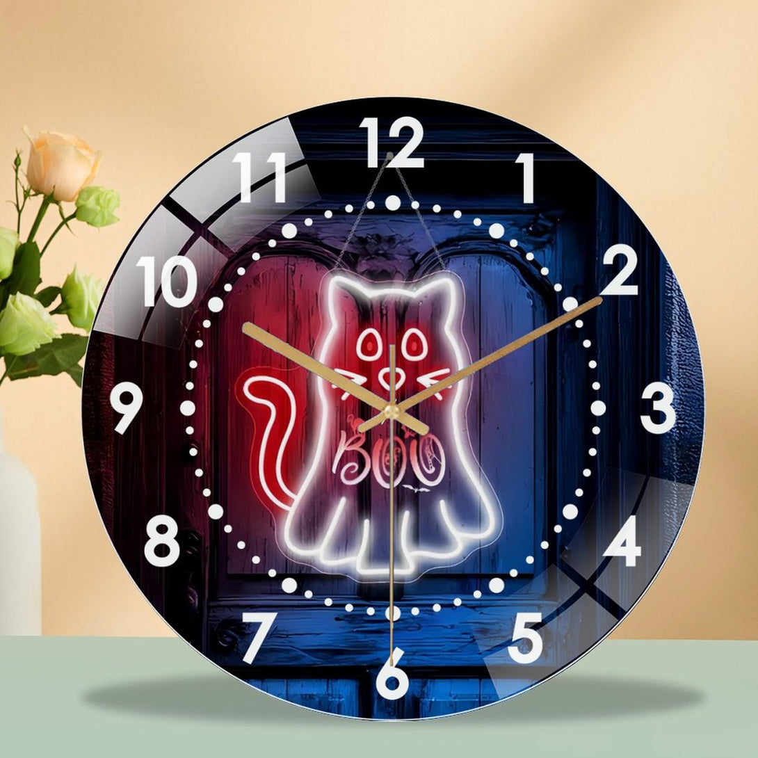Decor Wall Clock: Cat Gho-st Glass Wall Clock,Hallo-ween Funny Cat Boo Decor Wall Clock for Home Decor Hallo-ween Gho St Boo Haunted House Party Wall Art.homes, Bars, Offices, Man Caves,