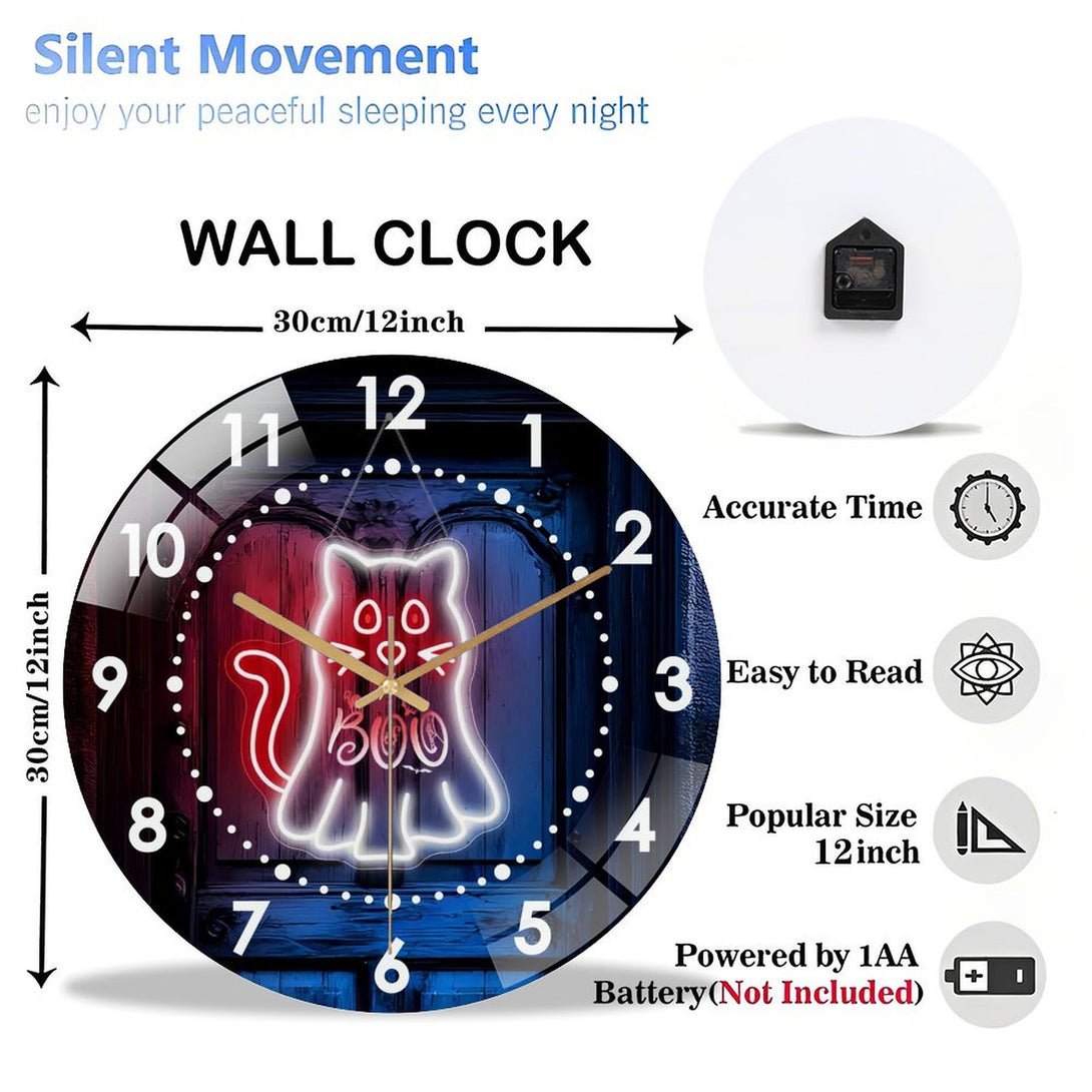 Cat Gho-st Glass Wall Clock,Hallo-ween Funny Cat Boo Decor Wall Clock for Home Decor Hallo-ween Gho St Boo Haunted House Party Wall Art.homes, Bars, Offices, Man Caves, Garages, And Living Rooms .Al,12×12inch(30×30cm)