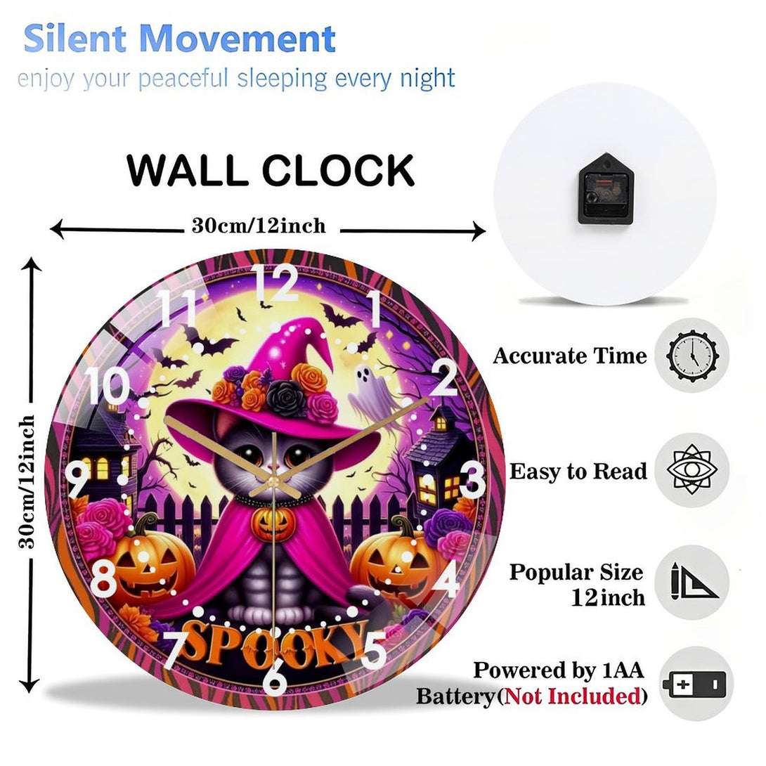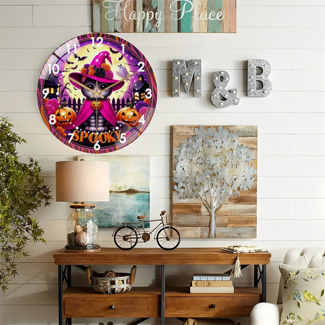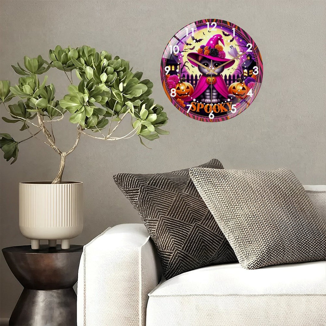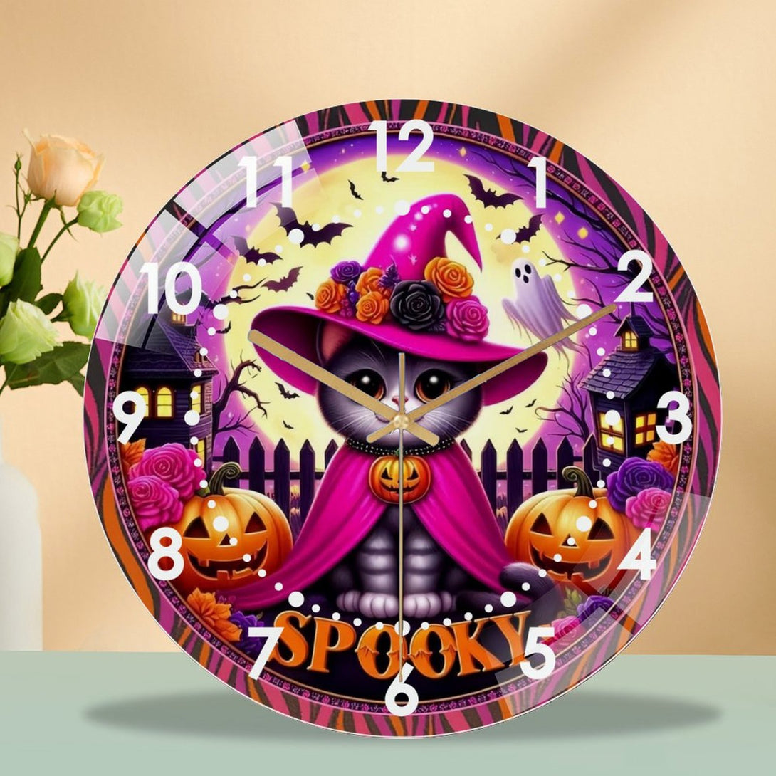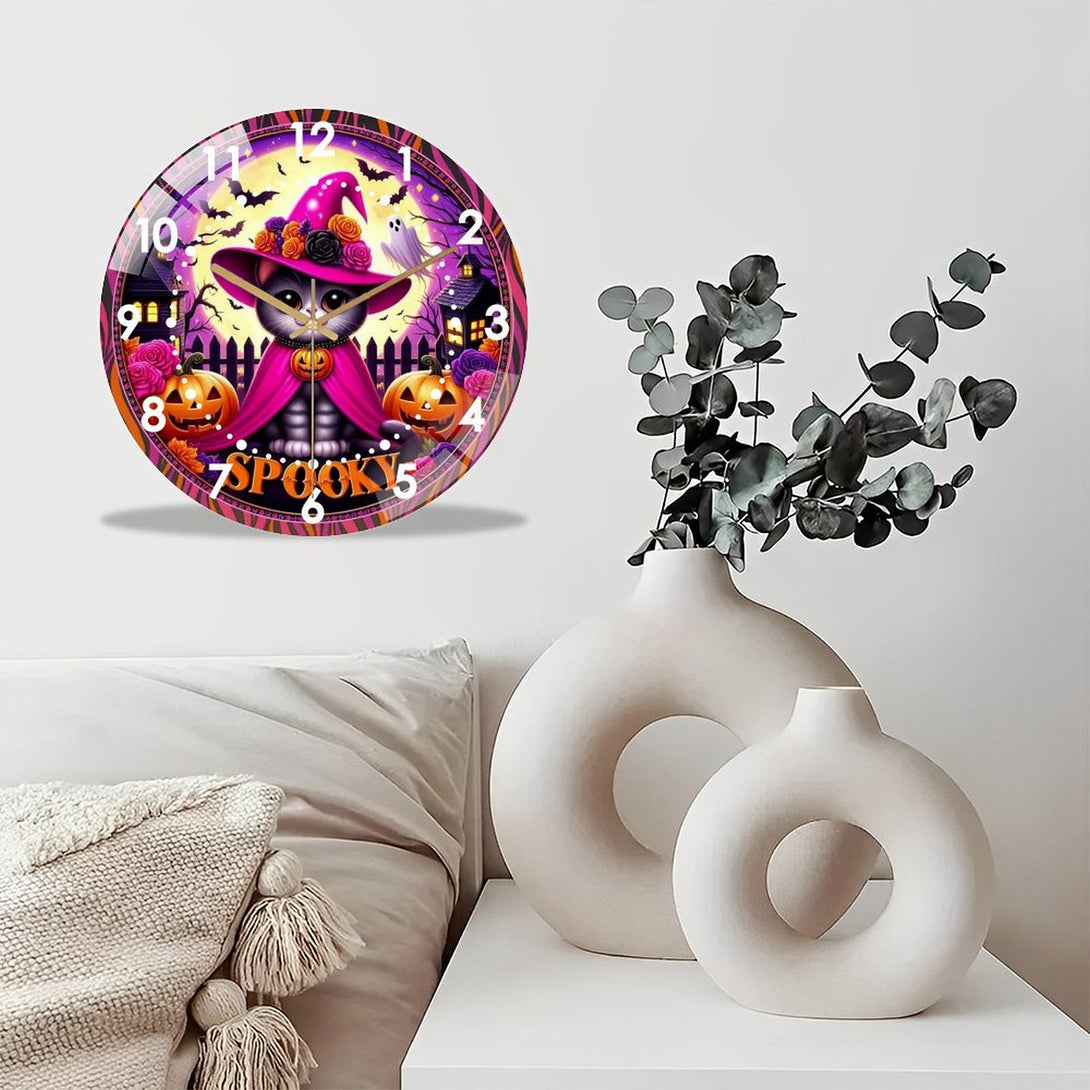Round Spooky Pink Cat Halloween- Glass Wall Clock, Witch Kitty Round Jack O Lantern Cat Decor Wall Clock for Homes, Bars, Offices, Man Caves, Garages, And Living Rooms .Also Makes A Great Gift.,12×12inch(30×30cm)