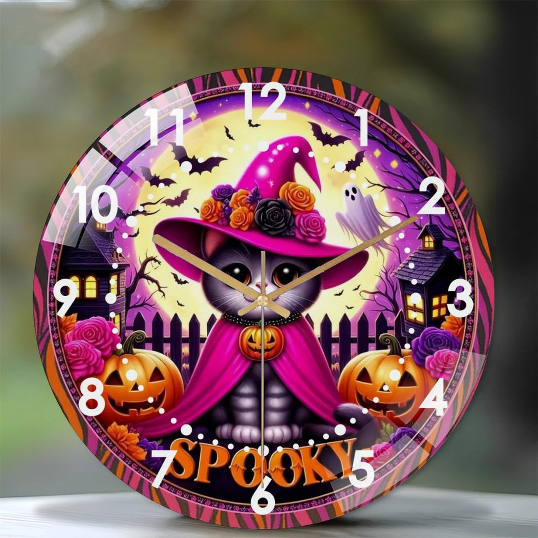Decor Wall Clock: Round Spooky Pink Cat Halloween- Glass Wall Clock, Witch Kitty Round Jack O Lantern Cat Decor Wall Clock for Homes, Bars, Offices, Man Caves, Garages, And Living Rooms
