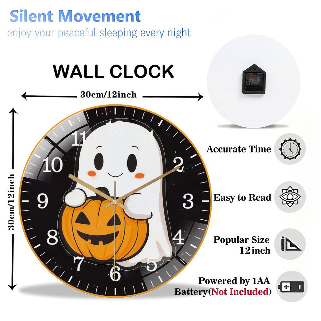 Cute Ghost Holding A Pumpkin Hallo Ween Glass Wall Clock, Trick Or Treat Decor Wall Clock for Homes, Bars, Offices, Man Caves, Garages, And Living Rooms .Also Makes A Great Gift.Hallo-ween Gift,12×12inch(30×30cm)