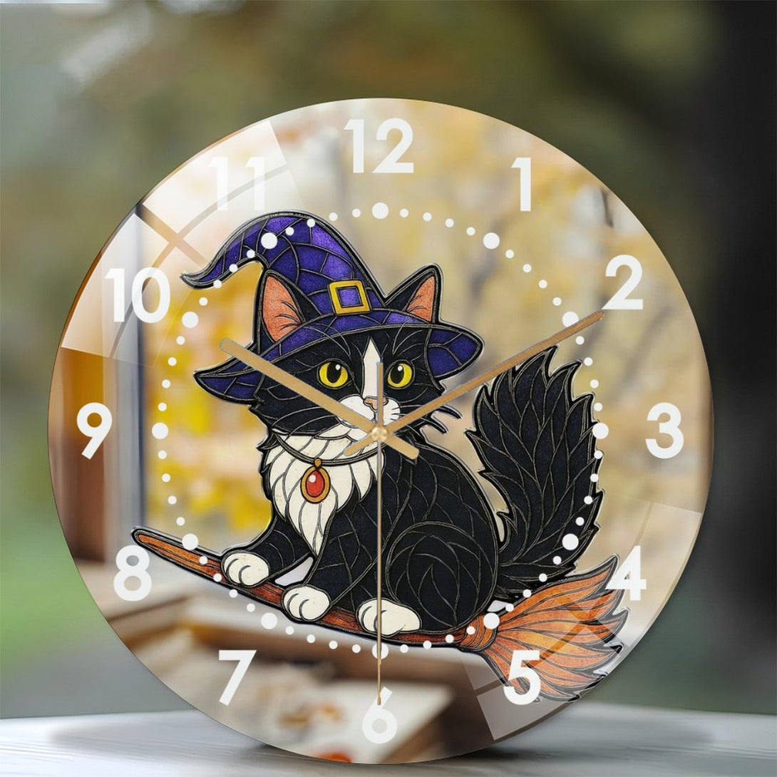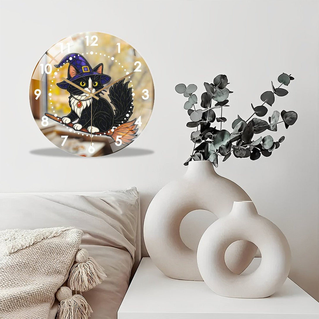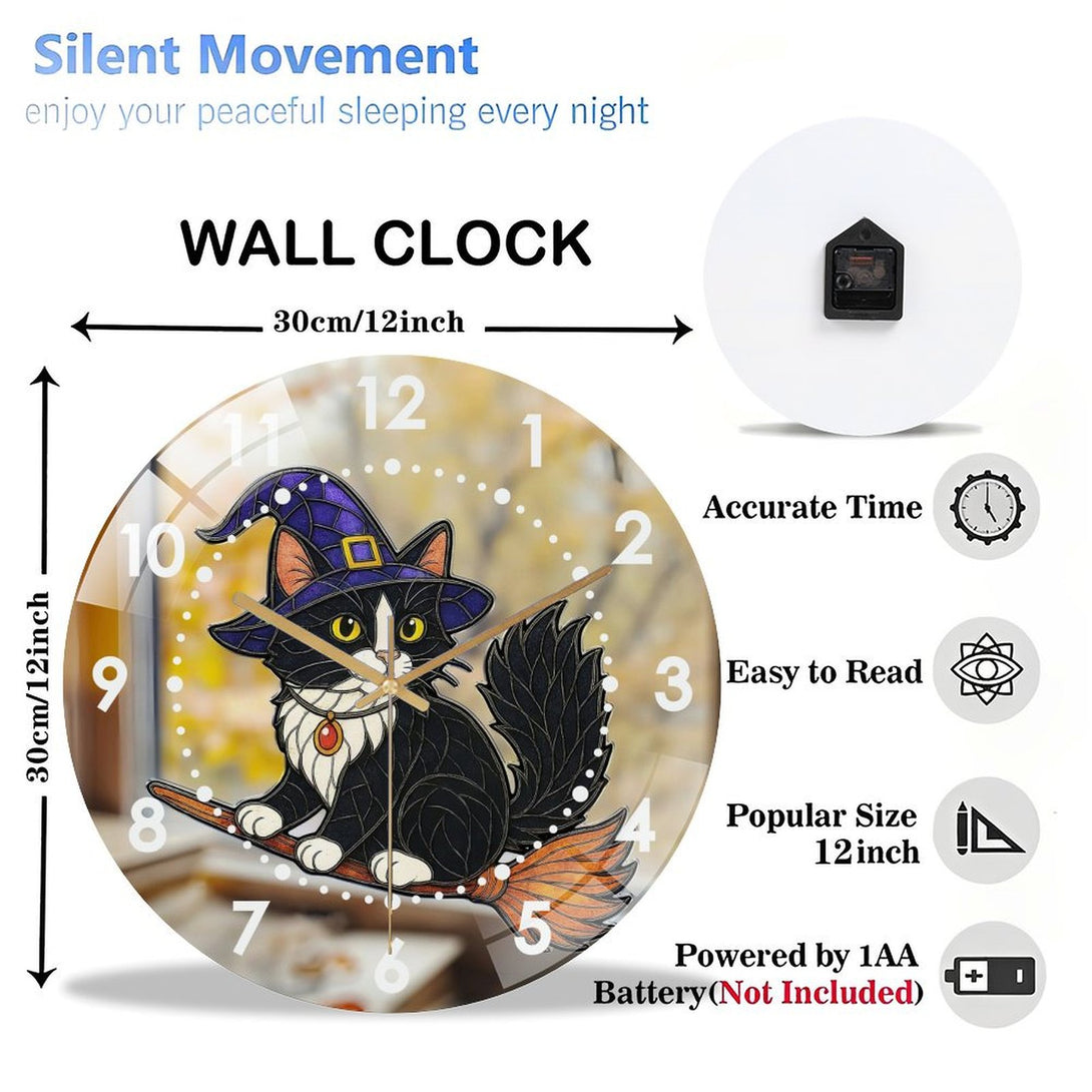 Spooky Tabby Cat Hallo-ween Window Art Glass Wall Clock, Dachshund Hallo-ween Home Decor Wall Clock, Hallo-ween Gift,Also Makes A Great Gift.,12×12inch(30×30cm)