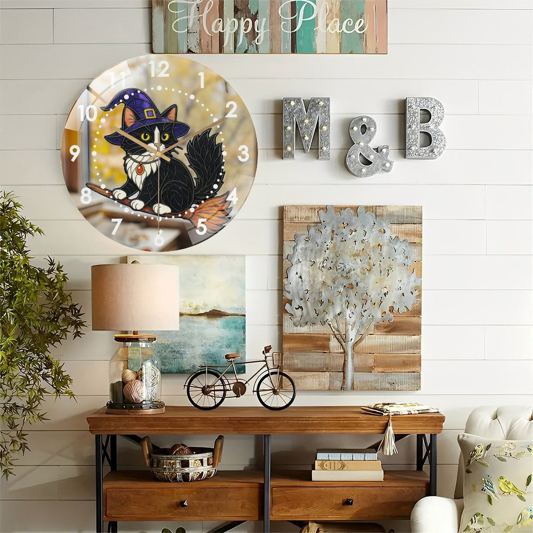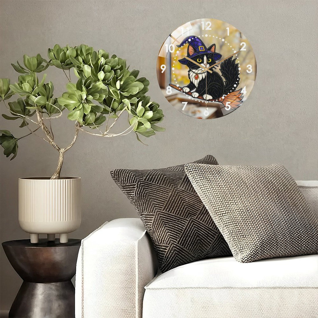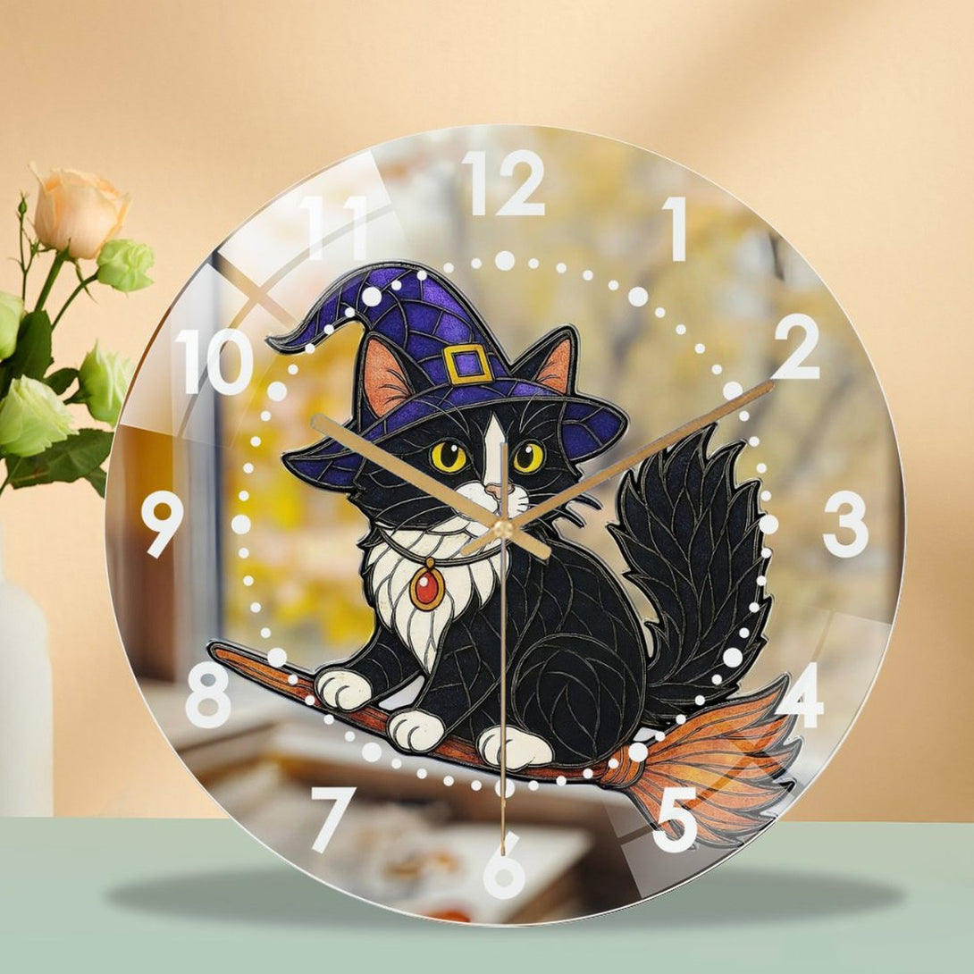 Spooky Tabby Cat Hallo-ween Window Art Glass Wall Clock, Dachshund Hallo-ween Home Decor Wall Clock, Hallo-ween Gift,Also Makes A Great Gift.,12×12inch(30×30cm)